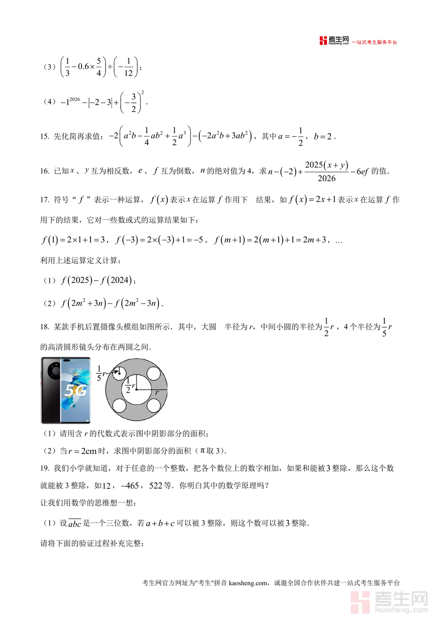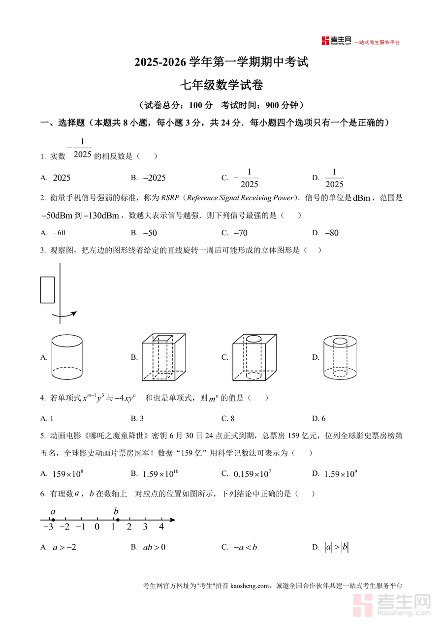《精品解析:广东省深圳市南山外国语学校(集团)2025-2026学年上学期七年级期中考试数学试卷(原卷版).docx》是一份针对南山外国语学校七年级上学期数学期中考试设计的权威备考资料。该资料包含选择题(8小题)、填空题(5小题)、解答题(7小题)三大题型,覆盖实数相反数、科学记数法、几何图形旋转、代数式化简求值、数轴应用等核心知识点,并以原卷版形式呈现,确保内容与该校实际考试题型、难度高度一致,为学生提供真实考试场景下的练习载体。