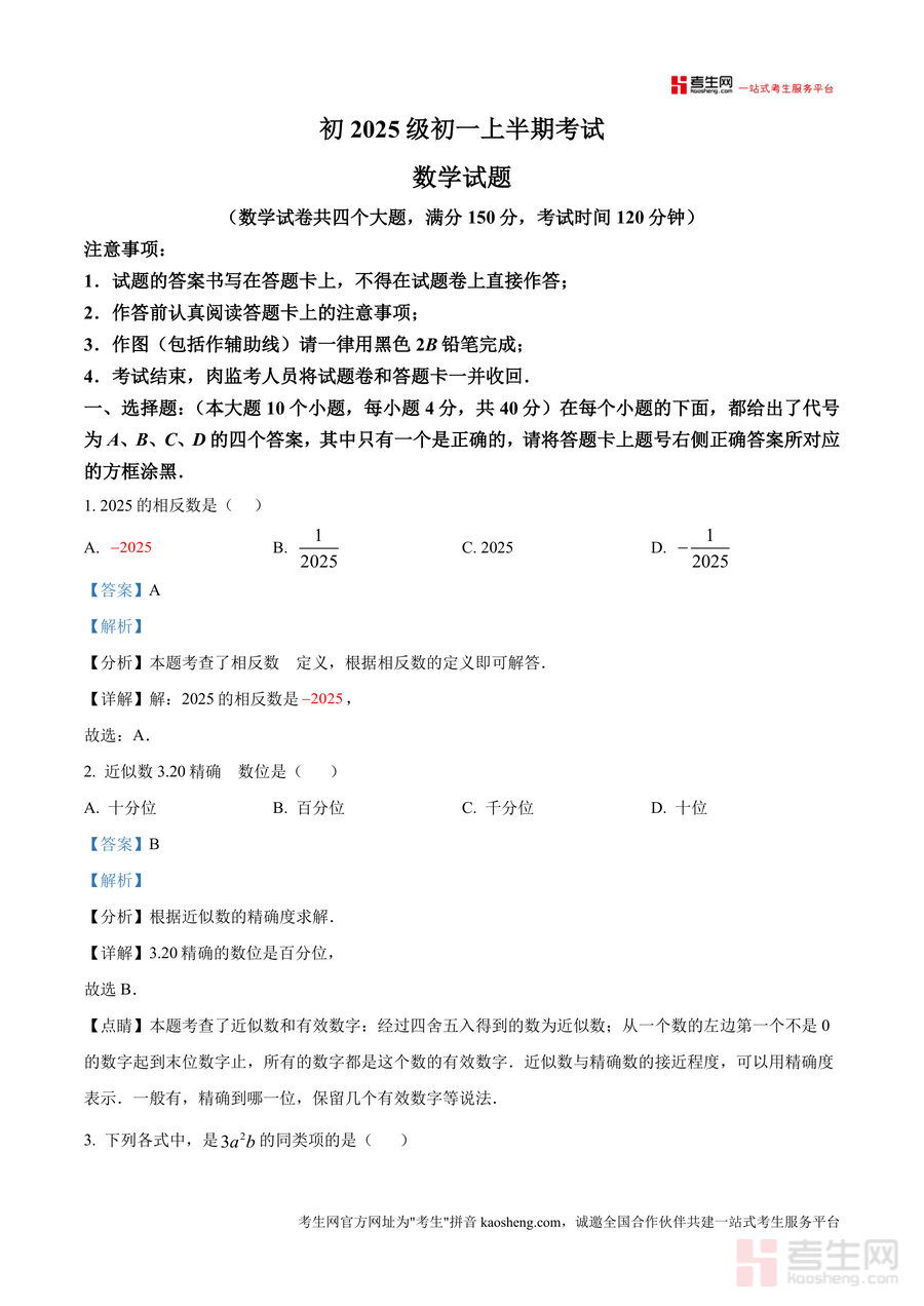 《精品解析:重庆市兼善中学2025-2026学年上学期七年级数学期中试卷(解析版)》是一份针对该校初2025级学生设计数学期中备考资料,包含完整试卷结构(四个大题、满分150分、考试时间120分钟)及详细解析内容。资料覆盖选择、填空、解答等题型,每个题目均配备考点分析(如相反数定义、同类项判断)、解题步骤和点睛提示,不仅呈现正确答案,更拆解思维过程,帮助学生理解核心知识点。作为优质真题解析资料,其贴合学校教学进度,能让学生直观感受期中命题方向与难度。