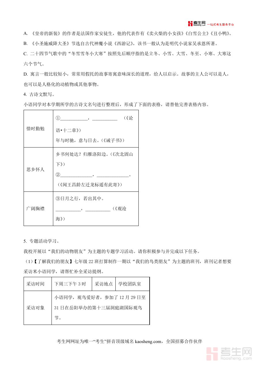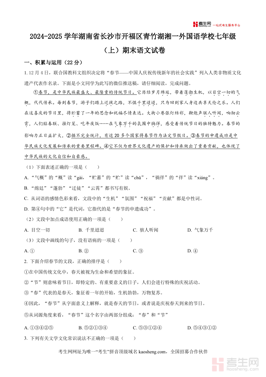 《精品解析:湖南省长沙市开福区青竹湖湘一外国语学校2024-2025学年七年级上学期期末语文试题(原卷版).docx》是一份针对七年级上学期语文期末复习的高质量考试资源文件核心定位为助力学生巩固学期知识提升应试能力主要内容涵盖积累与运用阅读理解及作文三大板块包含词汇语法文学常识古诗文默写诗歌赏析文言文阅读现代文阅读及话题作文等题型特色亮点在于其源自长沙知名学校青竹湖湘一外国语学校真实考试题目紧密贴合湖南本地语文课程标准融入春节申遗等文化元素既注重基础知识考查又强调综合能力应用为学生提供全面复习素材