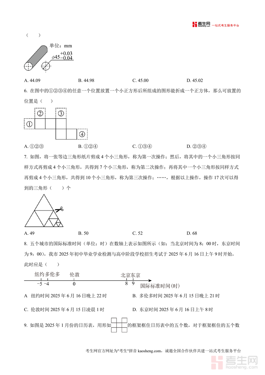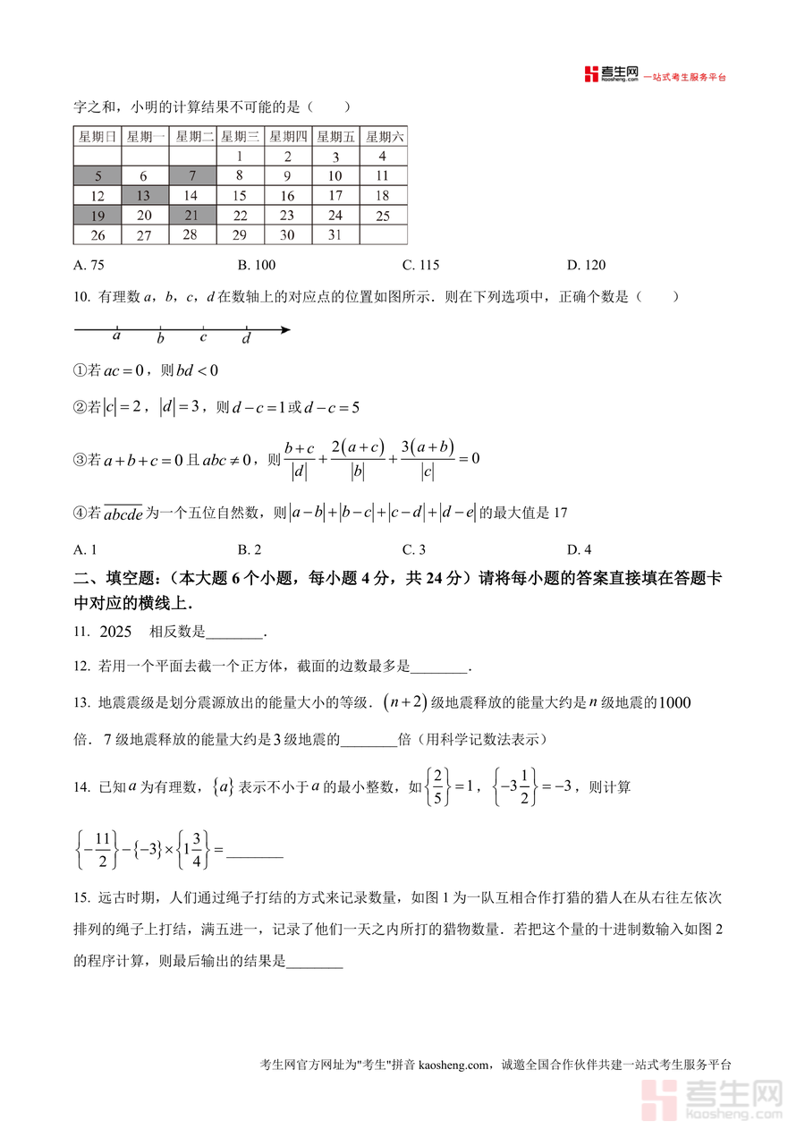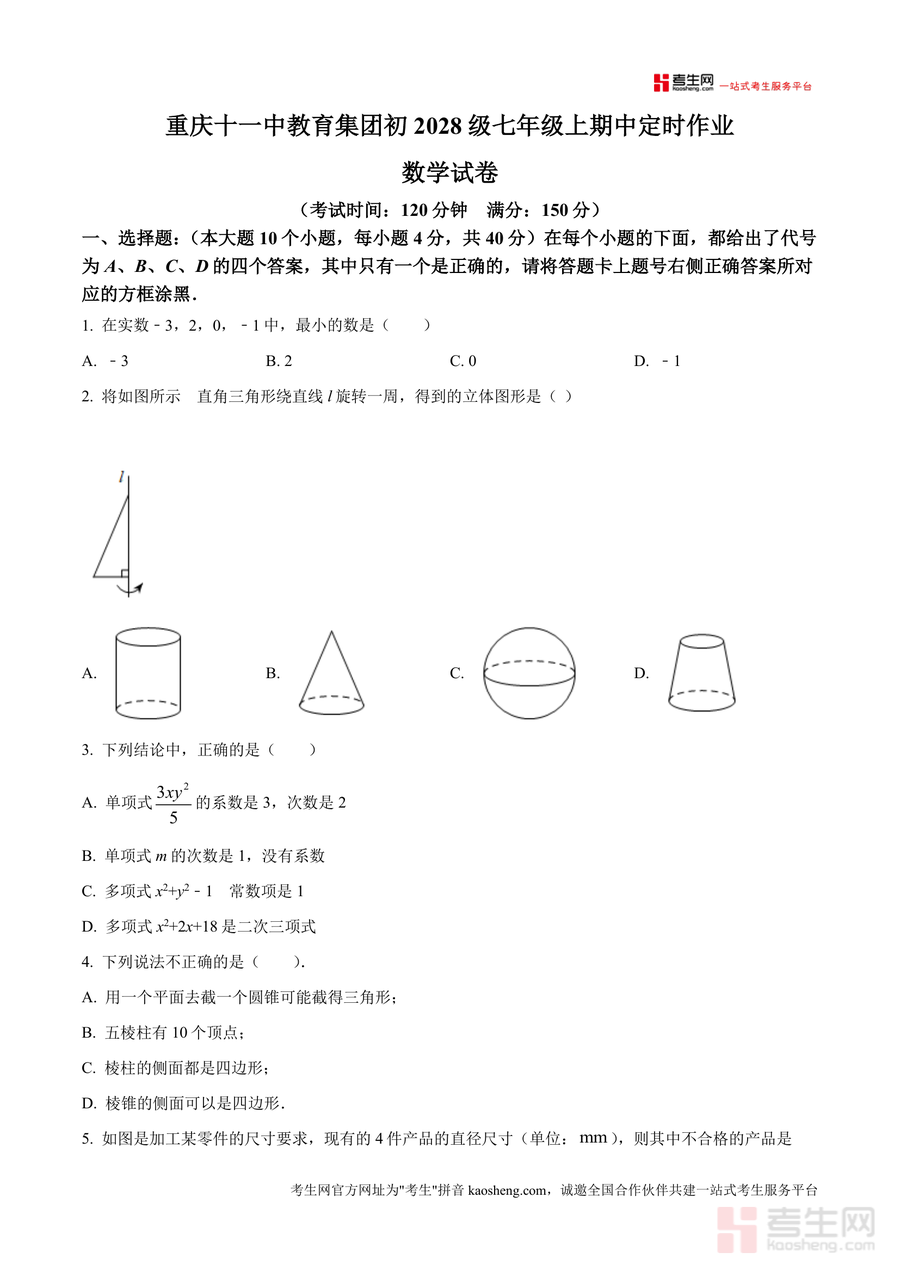 《精品解析:重庆市十一中教育集团2025-2026学年七年级上学期期中数学试卷(原卷版).docx》是一份针对重庆十一中教育集团初2028级七年级学生期中数学备考设计的优质真题资料,涵盖选择题(10小题)、填空题(6小题)、解答题(9小题)三大题型,全面覆盖实数大小比较、立体图形截面与旋转、整式运算、数轴应用、规律探究等七年级上册核心知识点。试卷严格遵循本地教学大纲设置分值结构(满分150分、考试时间120分钟),题目设计兼具基础性与拓展性——基础题考查相反数定义、单项式系数次数等核心概念;拓展题如立体图形旋转形成几何体判断、绝对值几何意义应用等,侧重逻辑思维与知识迁移能力,能精准反映学生阶段性学习成果。