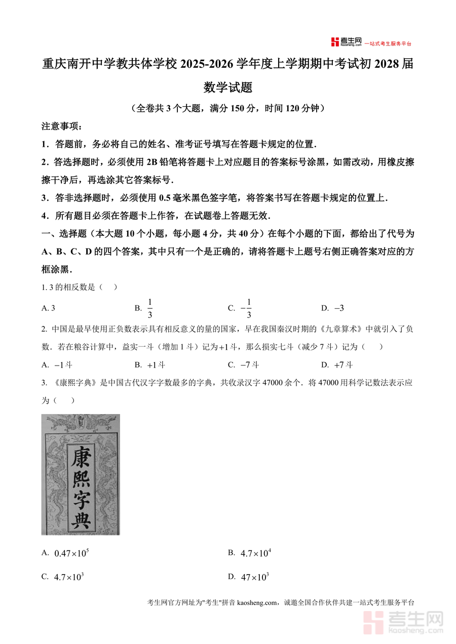 本资料适用于重庆市南开中学及教共体学校七年级学生、需系统备考期中数学考试的七年级学生及初中数学教师群体。作为期中备考不可或缺的资料,它具有不可替代性——真题是最直接反映考试方向与命题趋势的载体;长期价值体现在帮助学生巩固核心知识点,形成系统化解题思路,提升数学学科素养,为后续学习奠定坚实基础。
