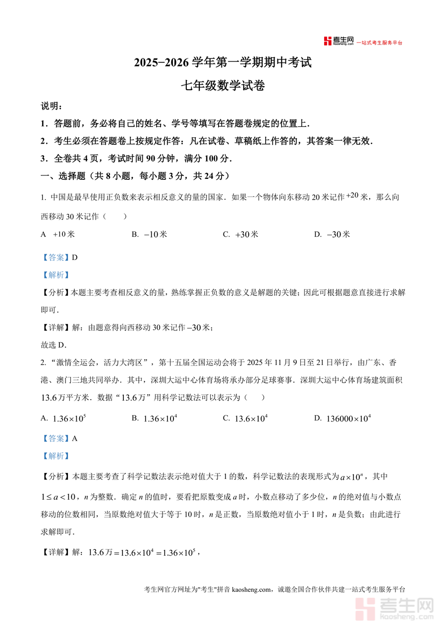 《精品解析:广东省深圳中学2025--2026学年上学期七年级期中考试数学试卷(解析版).docx》是一份针对七年级上学期数学期中阶段学习的高质量备考资料。文件包含完整的期中考试原题(含8道选择题、5道填空题及7道解答题)与逐题深度解析,覆盖有理数概念与运算、整式加减、几何图形展开与旋转、数字规律探索等七年级上册核心知识点。其特色在于解析部分不仅提供准确答案,还同步呈现考点定位、解题思路推导、易错点警示(如第5题对整式定义常见误区辨析)及同类题型拓展(如第18题规律题总结通用公式),助力学生掌握底层解题逻辑而非机械记忆。