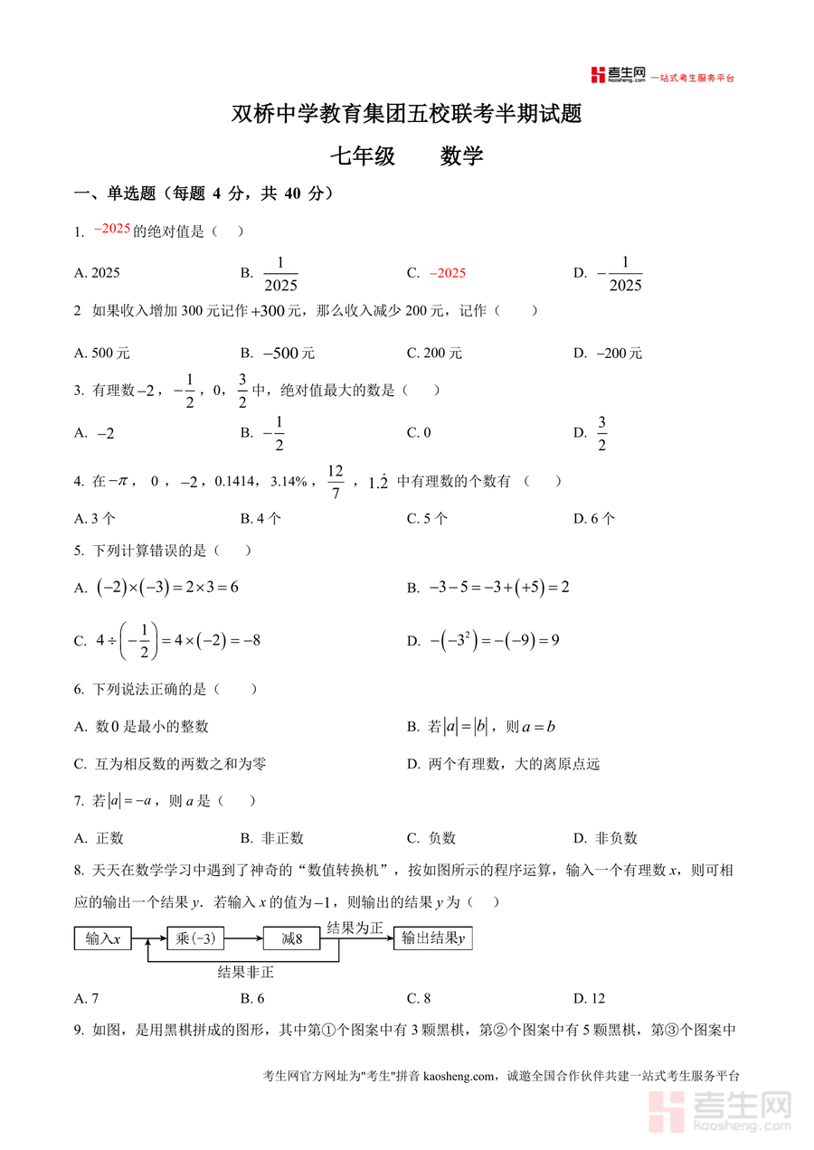 《精品解析:重庆市双桥中学教育集团五校联考2025-2026学年七年级上学期期中考试数学试题(原卷版).docx》是一份针对七年级上学期数学期中考试设计的区域性联考真题备考资料。该资料包含单选题(10题共40分)、填空题(6题共24分)、解答题(9题共86分)三大题型,覆盖绝对值、有理数运算、科学记数法、数轴应用、图形规律探究等核心考点;其特色在于依托双桥中学教育集团五校联考的权威性,题型设置贴合七年级上册数学教学进度,能真实反映区域内学生知识掌握情况及考试命题趋势,为备考提供精准参考。