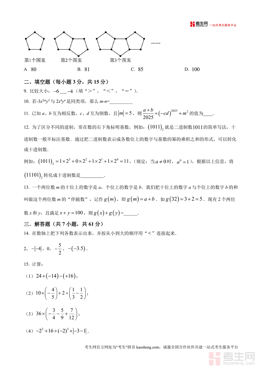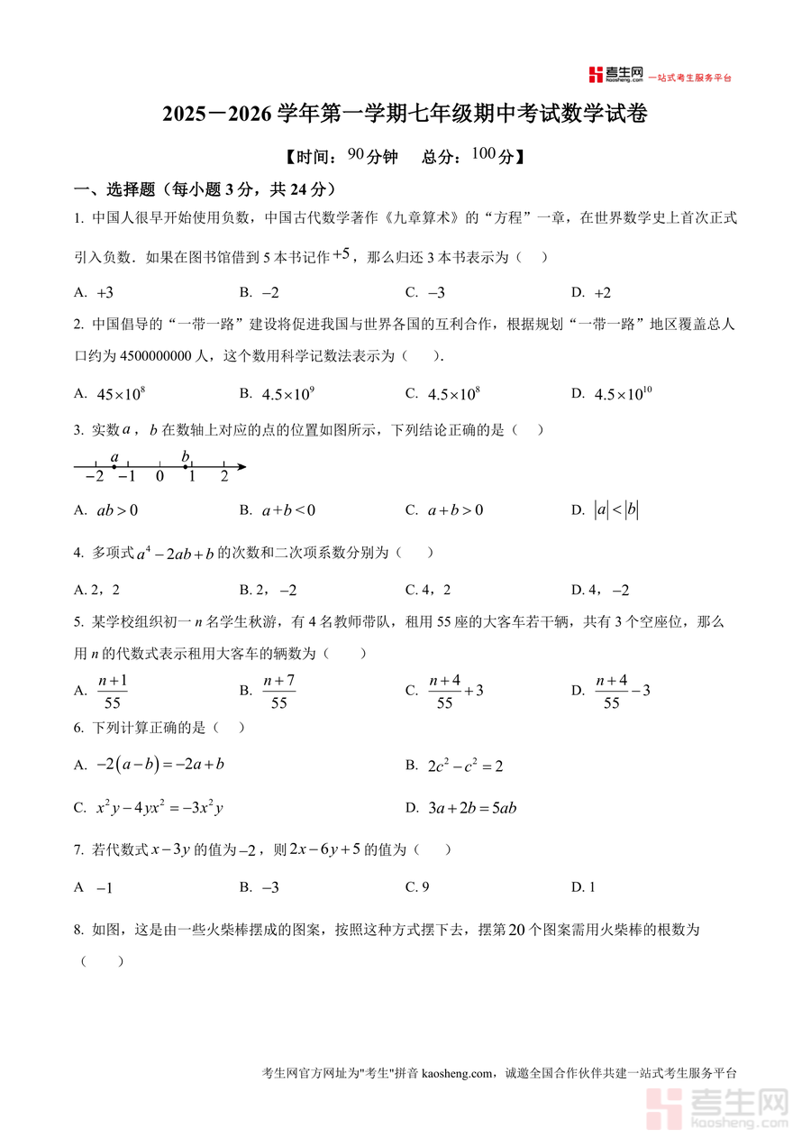 《精品解析:广东省深圳市北京师范大学南山附属学校初中部2025-2026学年七年级上学期期中数学试卷(原卷版).docx》是一份聚焦七年级上册数学期中阶段能力考查的区域名校真题资料,核心定位为北师大版教材体系下深圳本地期中测评复刻,主要内容覆盖有理数概念与运算、整式加减、数轴应用、代数式求值等核心知识模块,特色亮点在于严格还原该校期中考试题型结构(含选择题8道、填空题5道、解答题7道),分值设置贴合真实考试标准(总分100分),且题目设计兼顾基础巩固与能力拓展如科学记数法、同类项判断、规律探索等高频考点均有体现。