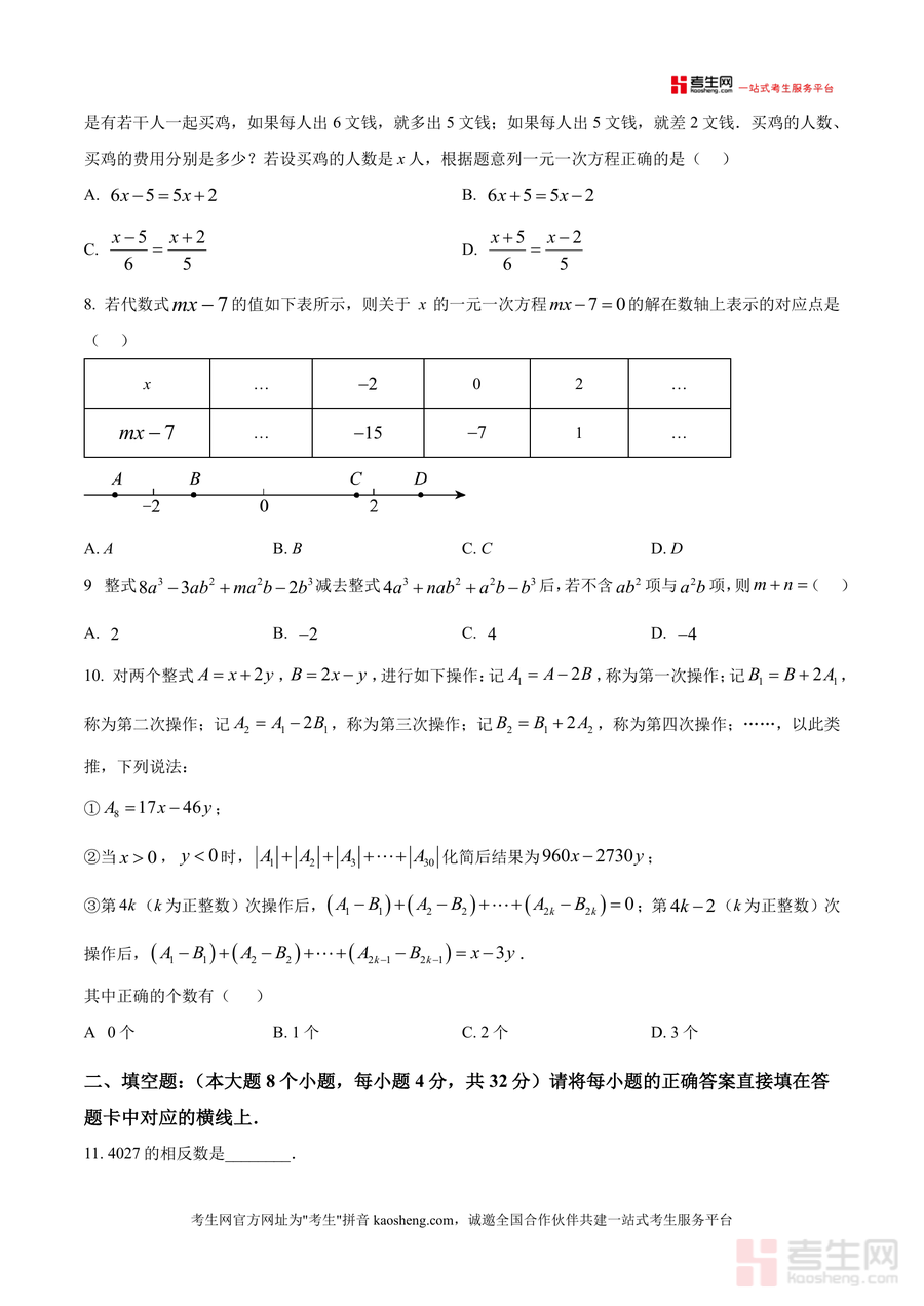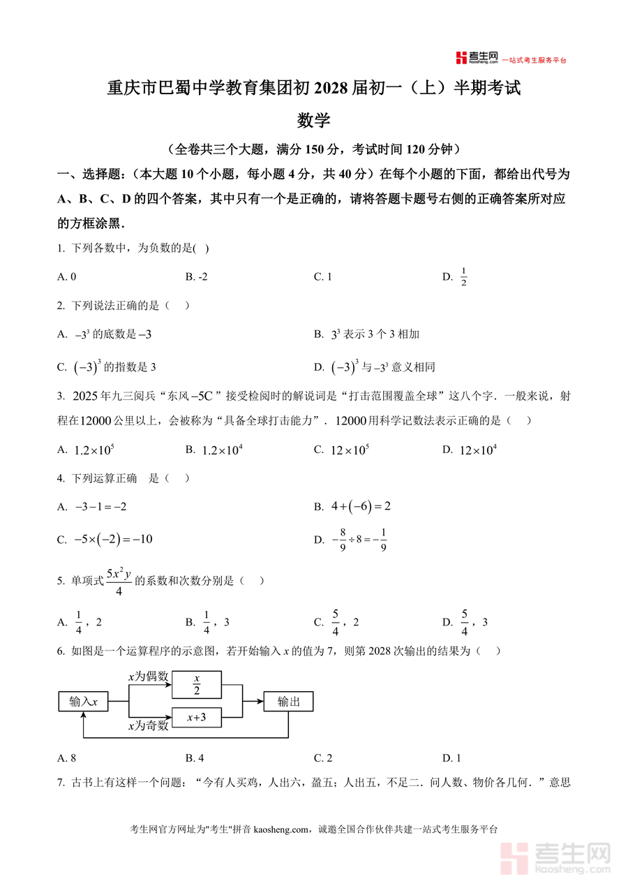 《精品解析:重庆市巴蜀中学校2025-2026学年七年级上学期期中考试数学试题(原卷版).docx》是一份针对七年级上册数学期中阶段检测的权威备考资料。该资料严格遵循重庆市巴蜀中学教育集团初2028届初一(上)半期考试命题标准编制,全卷共三个大题(选择题10道、填空题8道、解答题7道),满分150分且考试时间设置为120分钟,全面覆盖有理数运算、整式加减、一元一次方程应用等七年级上册核心知识点。其特色亮点在于依托巴蜀中学名校命题资源,题型设计贴合教学大纲要求,既包含基础概念题如负数判断、科学记数法应用,也涵盖综合应用题如列方程解实际问题、密码学与数轴结合等创新题型,能有效体现期中测试对知识掌握程度与应用能力的双重考查。