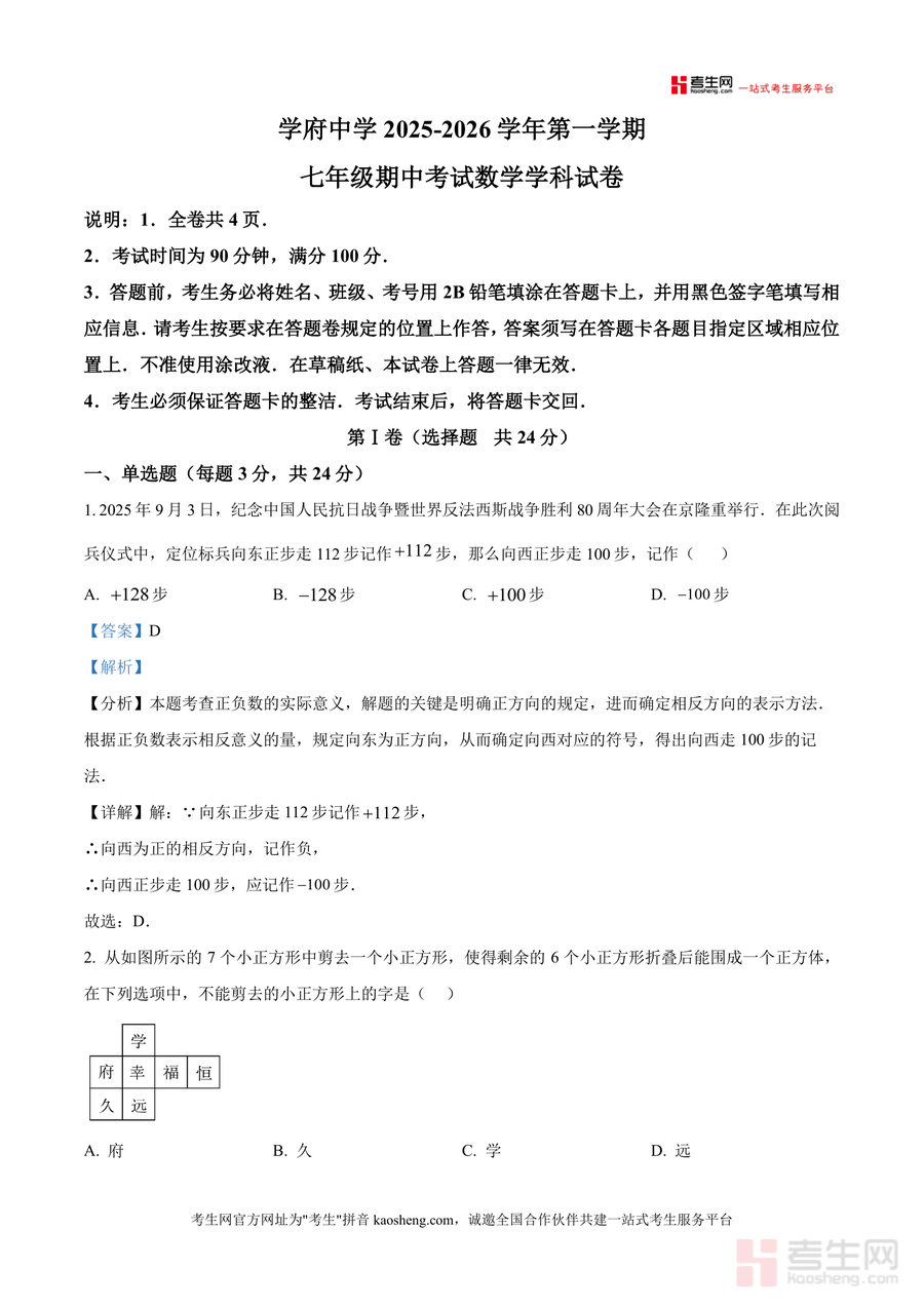 《精品解析:广东省深圳市南山区第二外国语学校(集团)学府中学2025-2026学年七年级上学期期中数学试卷(解析版).docx》是一份针对本地校考需求打造高质量真题解析类备考资料,包含完整试卷及逐题深度解析。内容覆盖七年级上册数学核心考点如正负数实际应用、科学记数法、立体图形展开与折叠、代数式化简求值等;解析部分除标准答案外,还融入考点定位、解题思路推导及易错点警示,助力使用者把握知识点本质。其特色在于贴合学府中学教学实际,题型设置匹配本地期中命题趋势,解析过程注重思维引导而非单纯结果呈现。