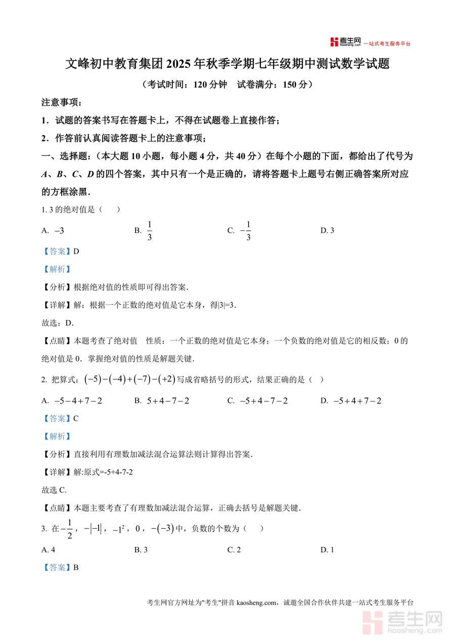 本资料适用于文峰教育集团及周边区域七年级学生,以及需要系统复习七年级上册数学的学习者。作为针对性极强的松区期中考前资料,它不仅能助力学生高效备战期中考试,还能通过强化核心知识点(如绝对值、有理数运算)和解题方法(如分类讨论、规律归纳),为后续数学学习奠定坚实基础,具有不可替代的松区期中备考价值与长期学习指导意义。