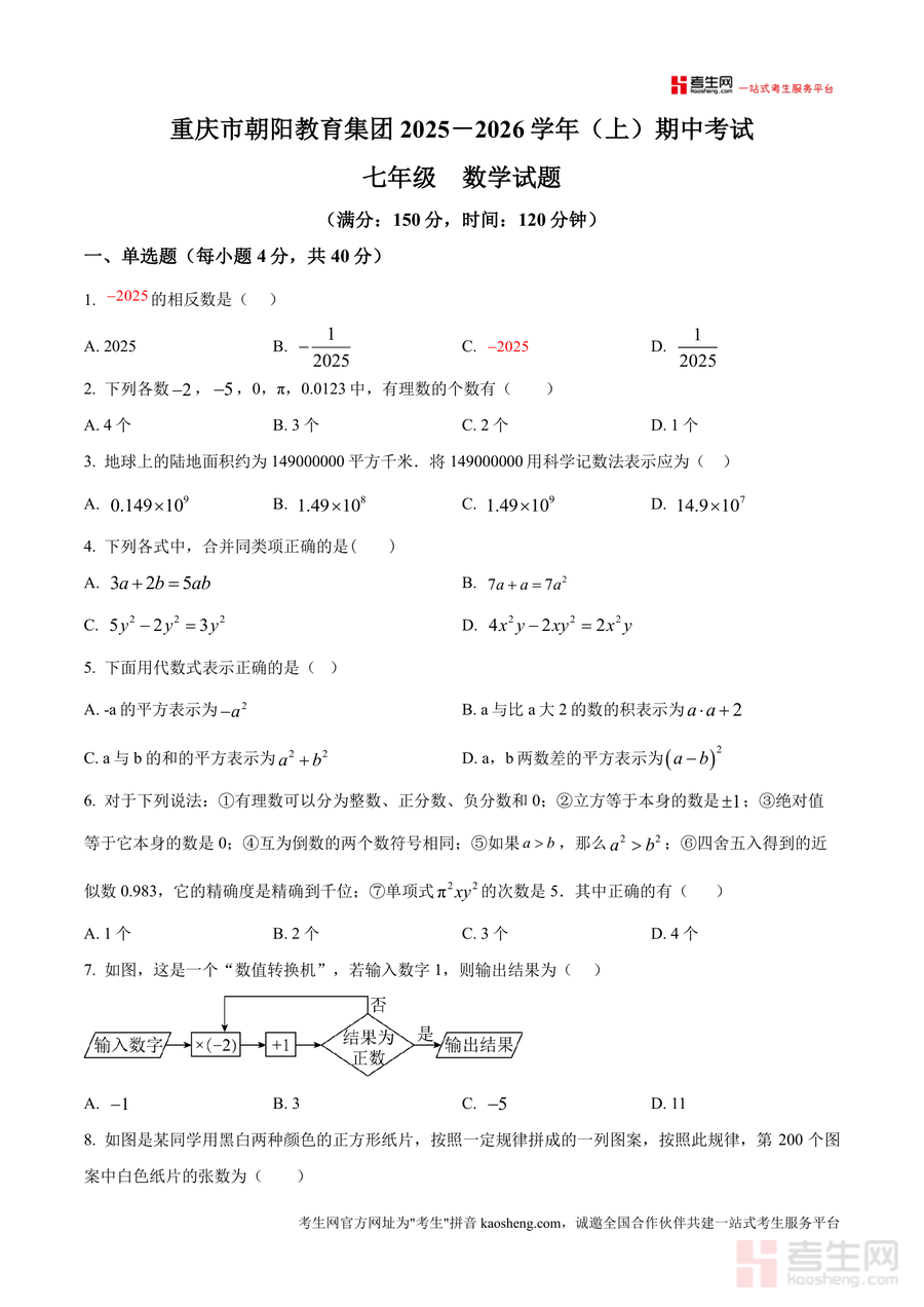 《精品解析:重庆市朝阳教育集团2025-2026学年上学期期中考试七年级数学试题(原卷版).docx》是一份聚焦重庆本地优质教育资源的七年级数学期中备考资料。该资料严格遵循朝阳教育集团命题标准,完整呈现期中考试原卷内容,包含单选题(40分)、填空题(24分)及解答题(86分)三大题型结构。考点覆盖相反数、有理数分类、科学记数法、同类项合并等七年级上册核心知识点,并融入规律探究、新定义运算、数轴综合应用等能力型题目,保留了集团命题的原貌与难度梯度,精准反映区域教学重点与学生能力要求。