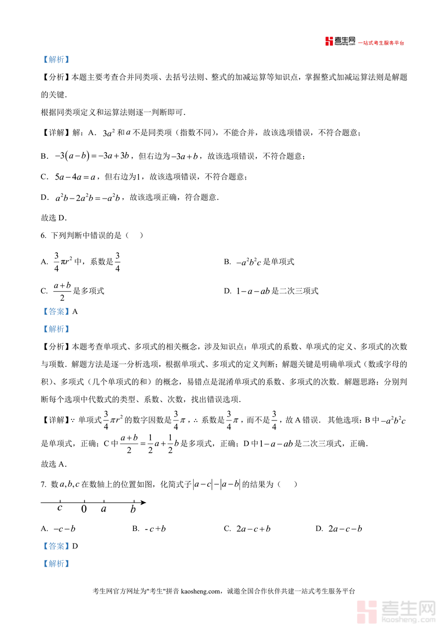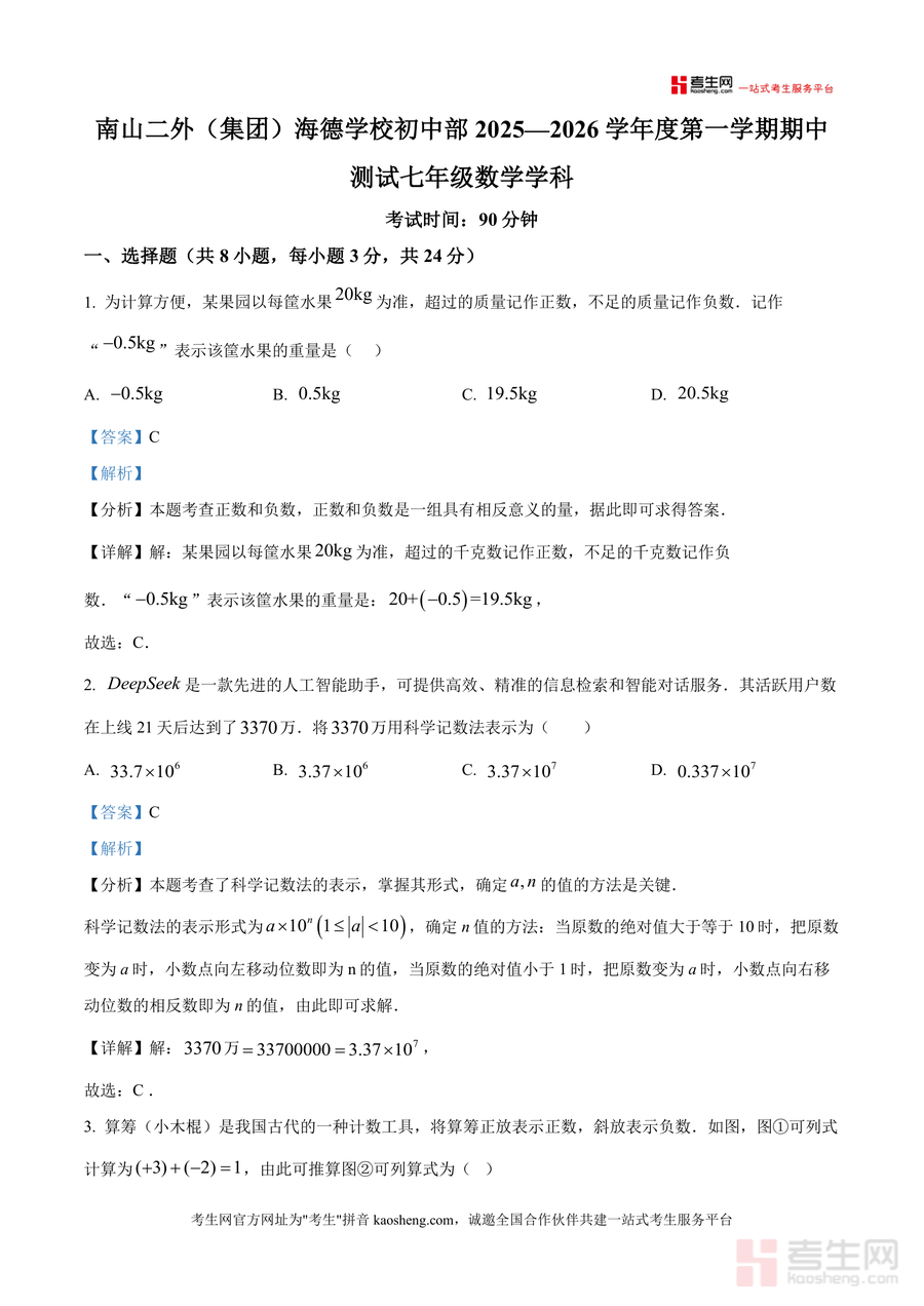 《精品解析:广东省深圳市南山区第二外国语学校(集团)海德学校2025-2026学年七年级上学期期中数学试卷(解析版).docx》是一份针对七年级上册数学期中备考需求打造优质真题解析资料。该资料完整呈现该校期中测试全卷内容,包含选择题(8小题)、填空题(5小题)、解答题(8小题)三大题型,覆盖正数与负数概念、科学记数法、有理数混合运算、整式加减等七年级上册核心知识点;特色在于每道题配备详实解析,不仅明确答案,更深入剖析考点本质、梳理解题思路标注易错点,如选择题第7题对数轴与绝对值化简结合考点的深度解读,帮助学生构建清晰解题逻辑。