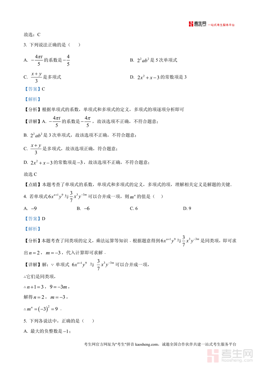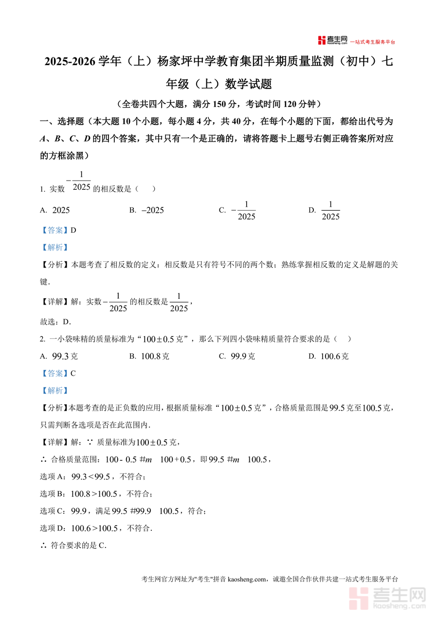《精品解析:重庆市杨家坪中学2025-2026学年上学期期中质量监测七年级数学试题(解析版)》是一份针对该校七年级上册数学期中检测的高质量真题解析备考资料。资料包含全卷四大题(选择题10道、填空题6道、解答题8道)共150分的完整试题及逐题详细解析,覆盖实数相反数、绝对值应用、整式运算、规律探究等七年级数学核心知识点。其特色亮点在于每道题均配备考点分析、分步解题思路及易错点提示——如选择题第3题对单项式系数与多项式定义进行细致辨析,填空题第16题"欢喜数"新定义题结合数论知识展开逻辑推导,帮助学生深入理解考点本质,同时融入应试技巧指导,提升解题效率。