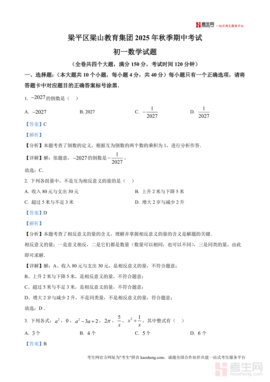 《精品解析:重庆市梁山初中教育集团2025-2026学年七年级上学期期中考试数学试题(解析版)》是一份针对七年级上学期数学期中备考设计 的专业真题解析资料。资料包含全卷四个大题(选择题、填空题、解答题等)完整原题及详细解析过程,覆盖有理数运算、整式加减、数轴应用等七年级上册核心考点;解析部分不仅明确标注每题答案,还附带考点定位、解题思路点拨及易错点提示,例如对"相反意义量""同类项判定"等易混淆知识点进行针对性解读,贴合梁山教育集团本地化命题风格与学情特点。