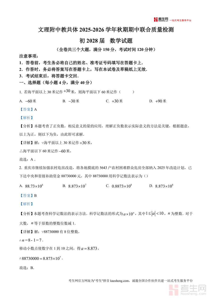 《精品解析:重庆市永川区文理附中教共体2025-2026学年上学期期中联合质量检测七年级数学试题(解析版).docx》是一份针对该区域七年级上学期期中联合质量检测数学试题编写专业备考资料,内容涵盖全卷三大题(选择、填空、解答题)及对应详细解析。其特色亮点包括教共体联合命题的区域权威性,解析过程对考点精准拆解(如正负数概念、科学记数法应用等核心知识点),解题思路分步呈现与易错点提醒,助力学生理解核心知识与解题逻辑。