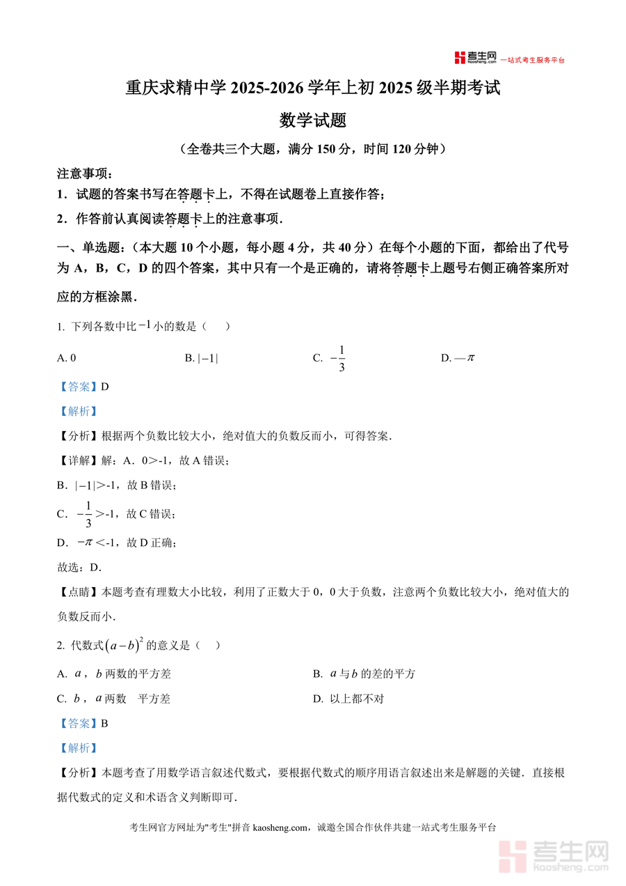 《精品解析:重庆市求精中学校2025-2026学年上学期七年级期中数学考试试卷(解析版).docx》是一份聚焦初一年级期中数学备考需求,依托本校真题编制而成的专业真题解析资料。文件涵盖全卷三大题型(单选题、填空题、解答题)原题及逐题精细化解析,每个题目均包含题干分析、步骤详解、易错点提示等模块,同步渗透七年级数学核心考点(如有理数运算、一元一次方程)与本校命题趋势,助力学生精准把握校考方向。