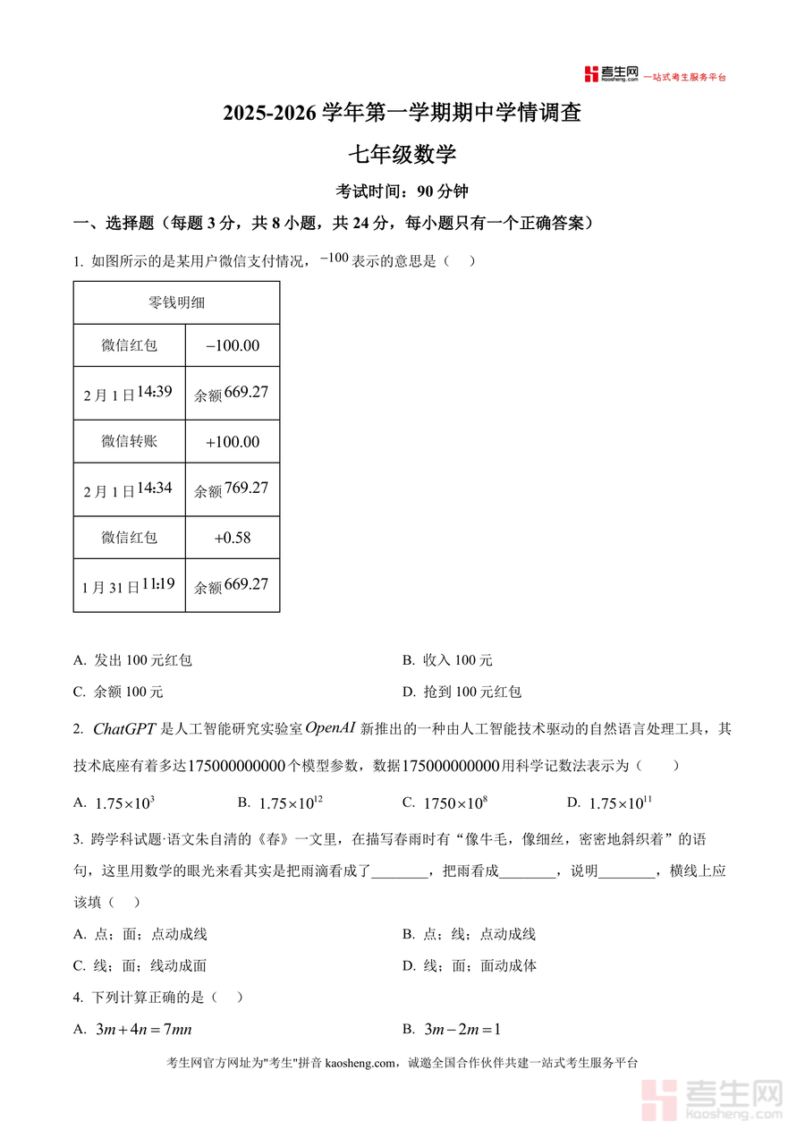 该资料核心用途为七年级学生期中复习阶段进行真题演练,助力学生熟悉考试题型结构与分值分布;使用场景包括课堂限时训练、课后自主刷题、教师备课参考及家长辅助辅导。用户价值方面,通过原卷练习可帮助学生精准定位知识薄弱点,提升应试能力;备考优势在于原卷版能还原真实考试情境,让学生提前适应考试节奏与难度,比普通模拟题更具针对性与参考价值,是备考期中不可或缺的资料。