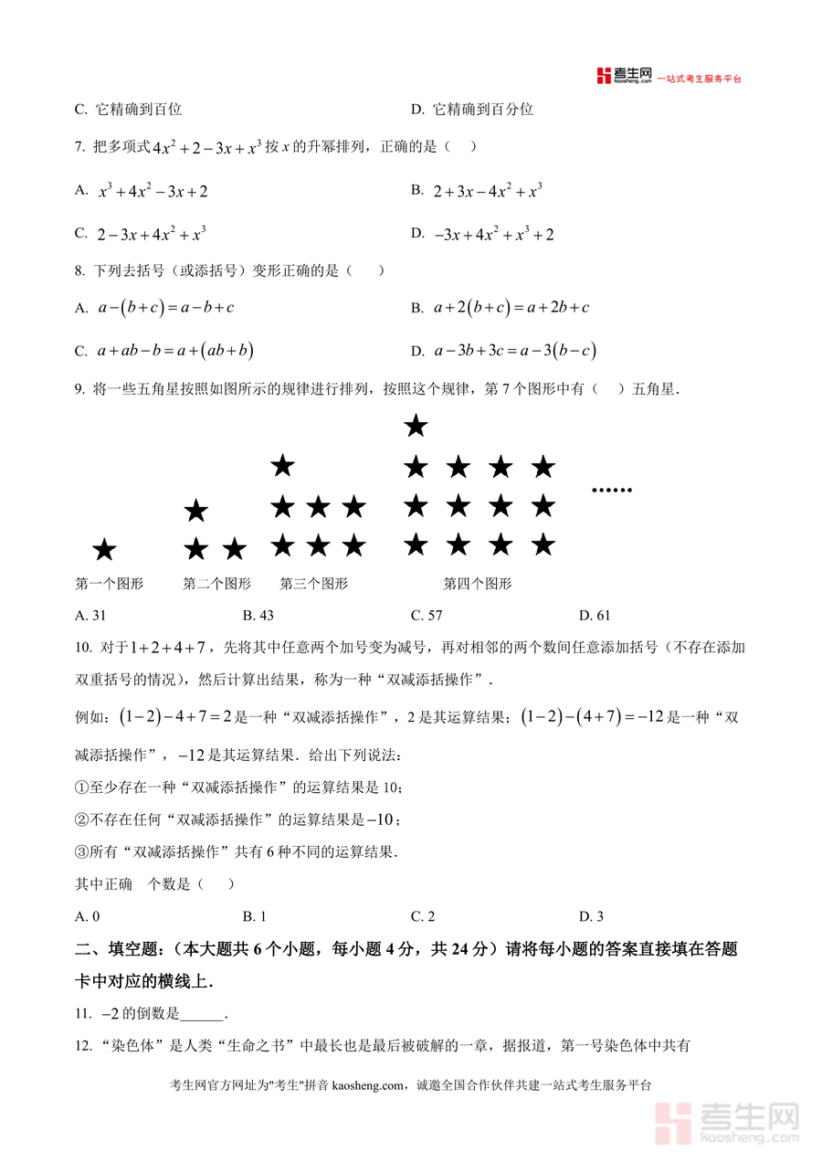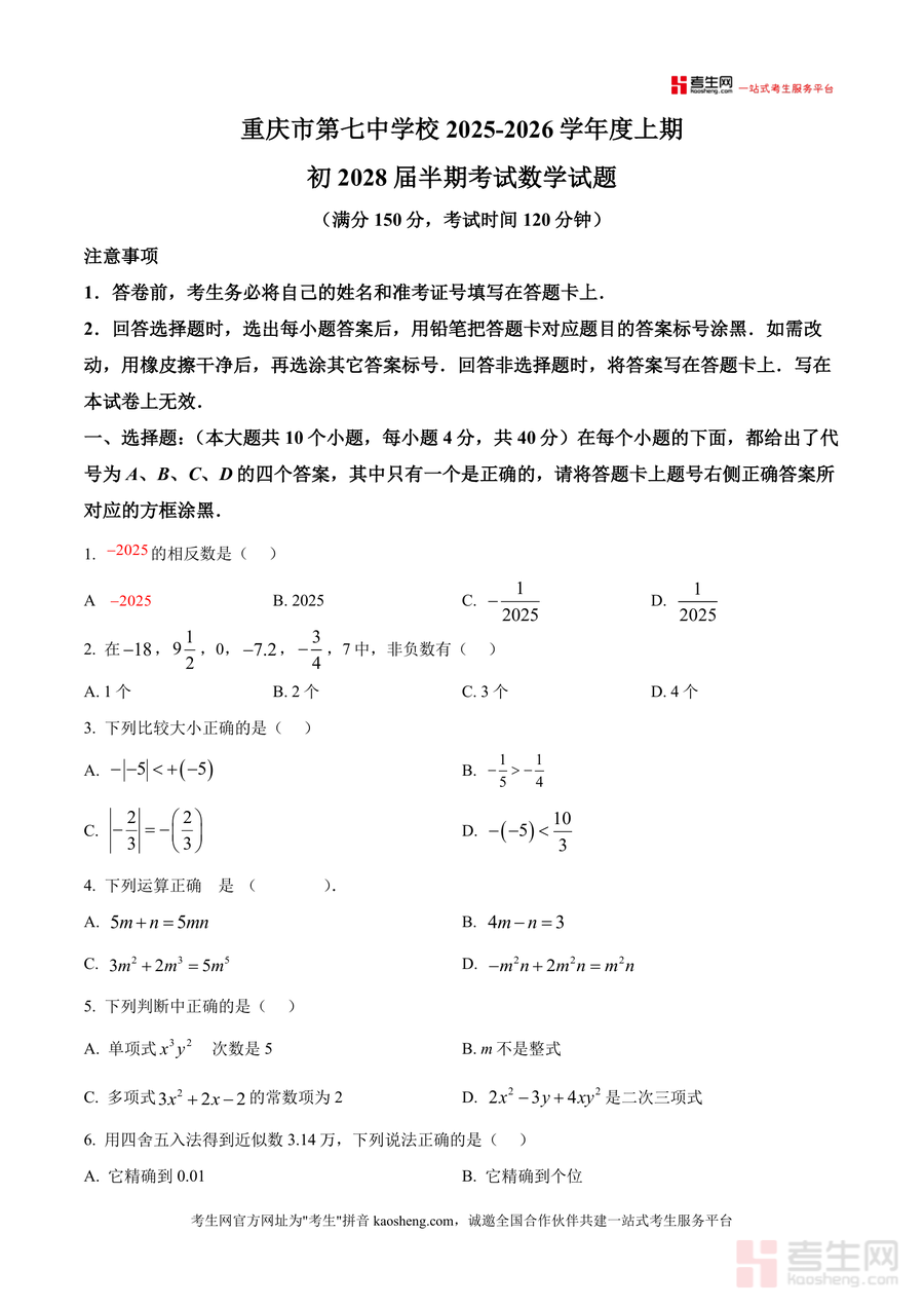 本资料适用于重庆市第七中学校初2028届七年级学生、数学教师及相关家教辅导人员。作为该校官方期中试题原卷版,其具有不可替代性——能精准反映该校教学重点与考核要求,是学生备考期中的必备资料。长期来看,该试题可作为后续复习巩固核心知识点的重要素材,帮助学生构建完整的数学知识体系,为初中阶段数学学习奠定坚实基础。