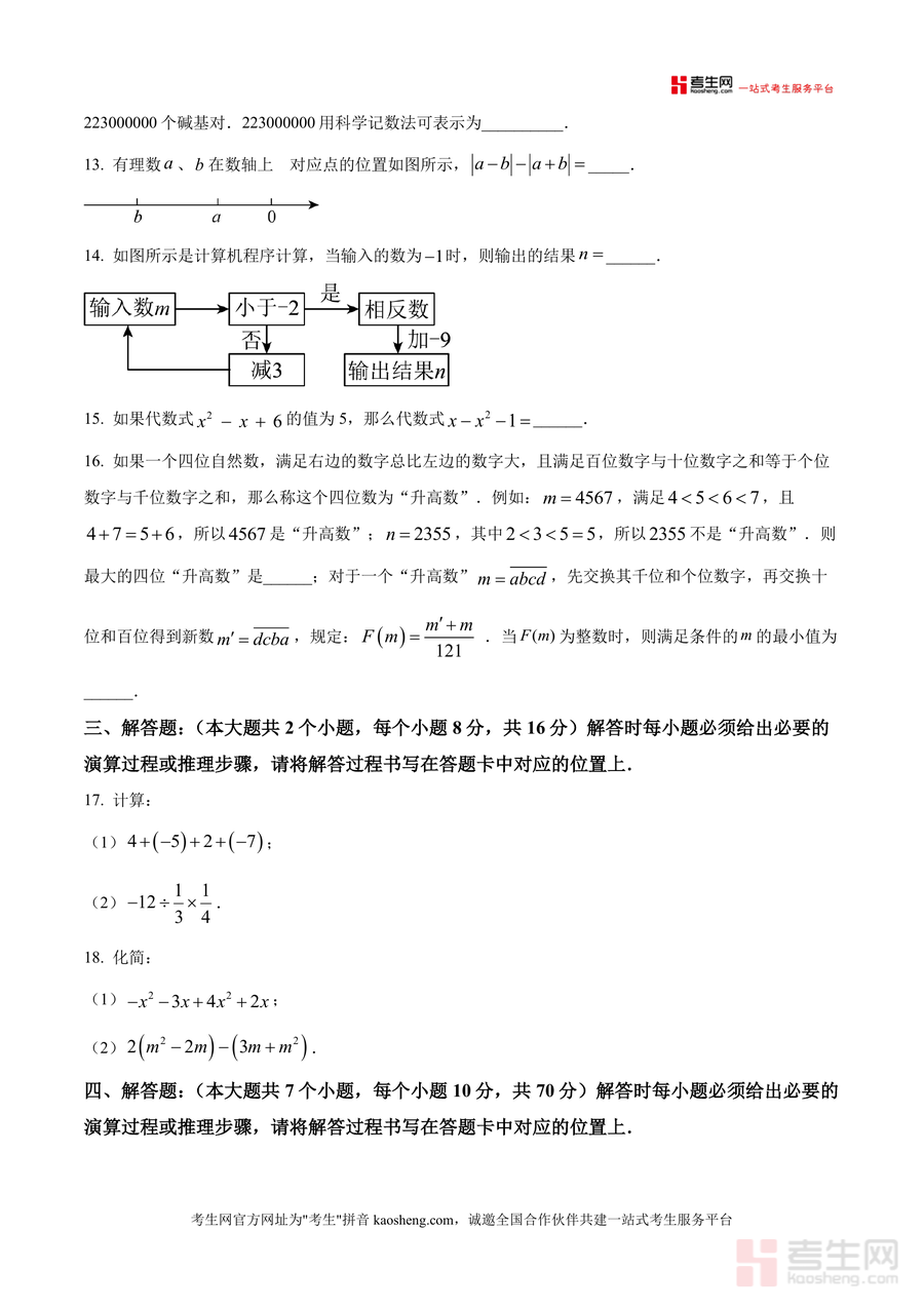 《精品解析:重庆市第七中学校2025-2026学年上学期七年级期中考试数学试题(原卷版)》是一份针对重庆七中初2028届学生期中数学备考的权威真题原卷资料。该资料严格遵循该校期中命题规范,包含满分150分、考试时间120分钟的完整试题结构,涵盖选择题(10题40分)、填空题(6题24分)及解答题(9题86分)三大模块。试题内容紧密围绕七年级上册数学核心知识点,如有理数的概念与运算、整式加减、数轴应用、规律探究等,同时融入创新题型如"升高数"定义理解、"双减添括操作"逻辑分析等,既考查基础能力又兼顾思维拓展,充分体现该校教学特色与命题方向。
