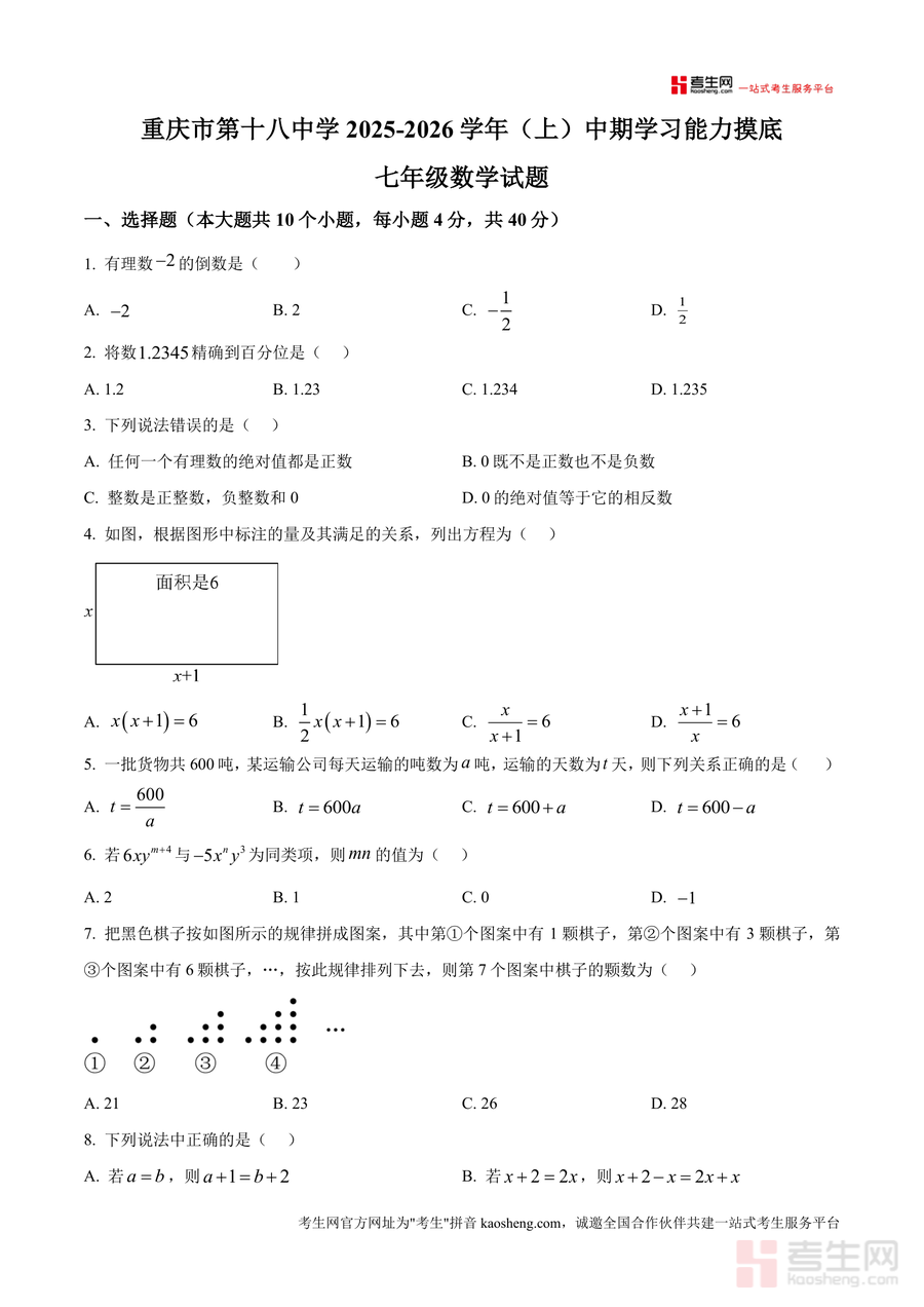本资料适用于重庆市第十八中学及周边同类学校的七年级学生,尤其适合需要进行期中备考规划或希望提升数学综合能力者。作为原卷版试题,它能还原真实考试场景,让学生在练习中积累实战经验;其不可替代性体现在真题所蕴含的命题逻辑与考点分布,是其他模拟题无法比拟的;长期价值则在于帮助学生构建系统的知识框架,培养规范解题习惯,为后续数学学习奠定坚实基础。