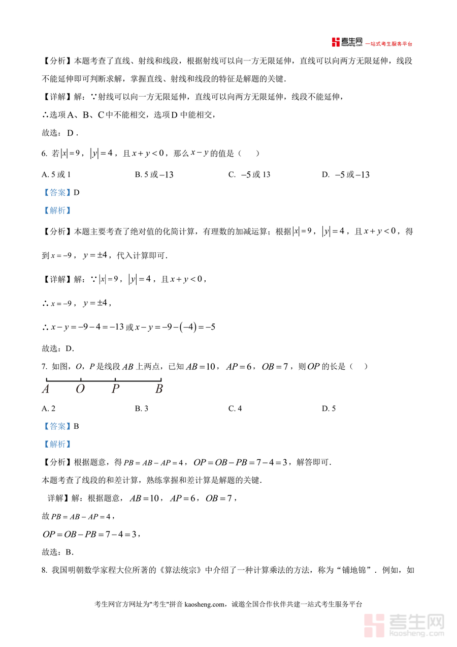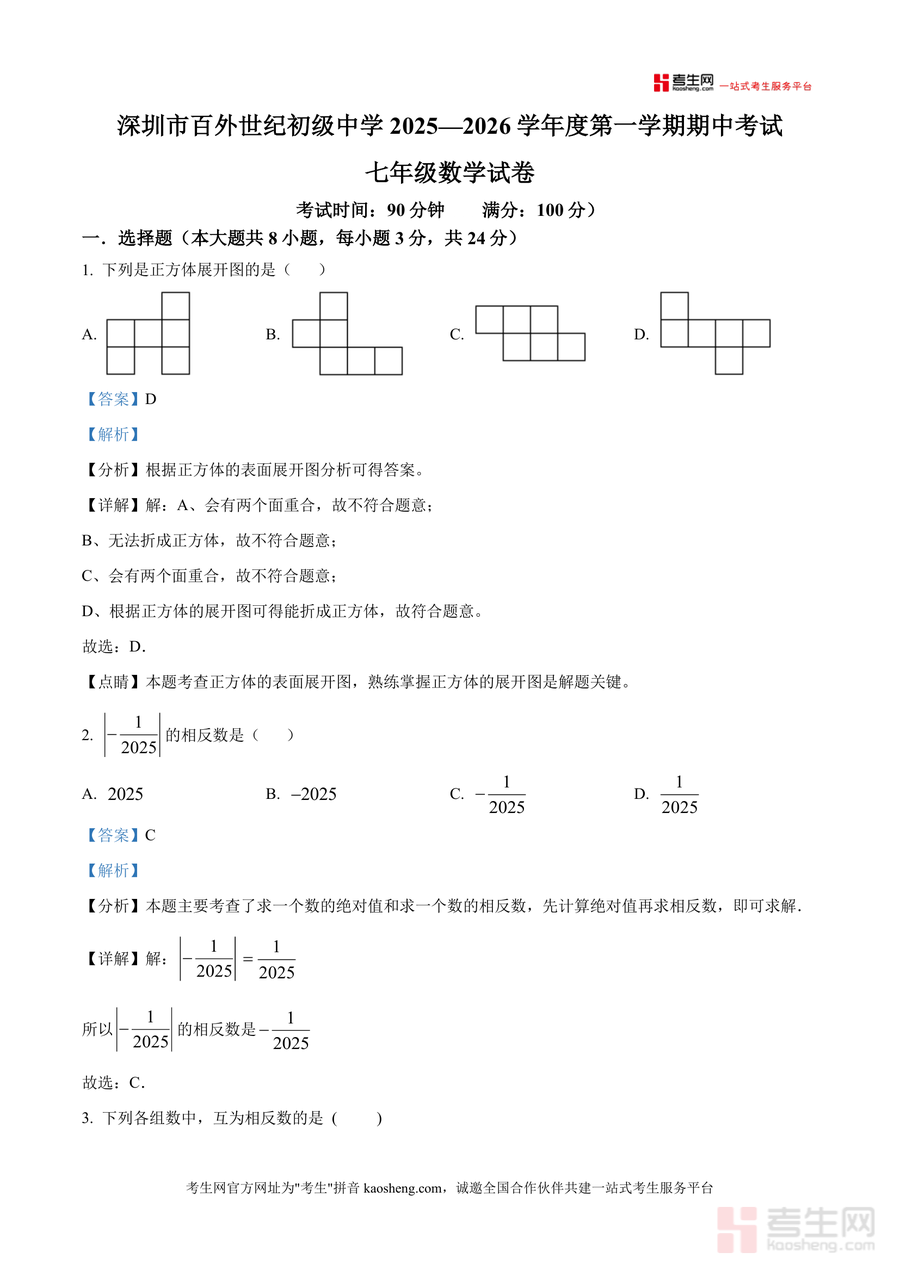 《精品解析:广东省深圳市百外世纪初级中学2025-2026学年七年级上学期期中数学试卷(解析版).docx》是一份针对该校七年级上学期期中数学考试的权威真题解析备考资料。文件包含完整试卷原题及详细解析,覆盖选择题(8道)、填空题(5道)、解答题(7道)全题型,解析内容结合考点分析、解题步骤及易错点提醒——如正方体展开图题明确表面展开规律类型划分,相反数计算强调先取绝对值再求反的逻辑顺序,铺地锦新定义题拆解操作步骤并标注关键数字处理方法。其特色亮点在于贴合该校命题风格,针对学生常见错误点设计"点睛"总结,如单项式系数符号易忽略问题、数轴折叠题距离计算技巧等,帮助使用者快速掌握核心解题方法。