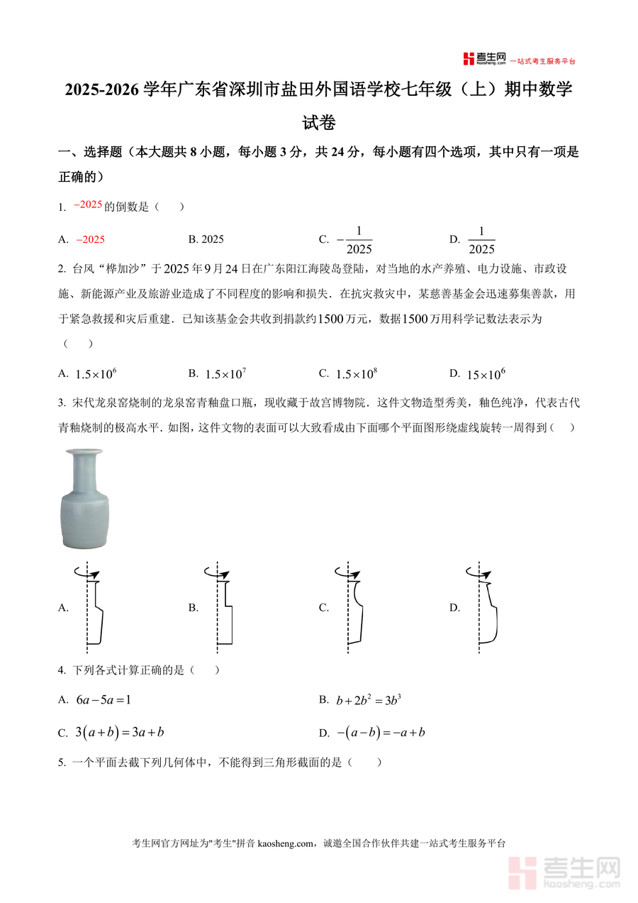 《精品解析:广东省深圳市盐田外国语学校2025-2026学年七年级上学期期中数学试卷(原卷版).docx》是一份针对深圳盐田外国语学校七年级上册数学期中考查设计的标准化真题资料。该试卷严格遵循初中数学教学大纲及该校教学进度,涵盖有理数、代数式、几何图形等核心知识模块;试卷结构清晰,包含8道选择题(24分)、5道填空题(15分)及7道解答题(61分),题型覆盖倒数计算、科学记数法应用、几何体旋转形成、代数式意义辨析、幻三角游戏等典型考点。其特色在于贴合深圳本地教学实际与该校命题风格,能精准反映期中考查重点与难度梯度。
