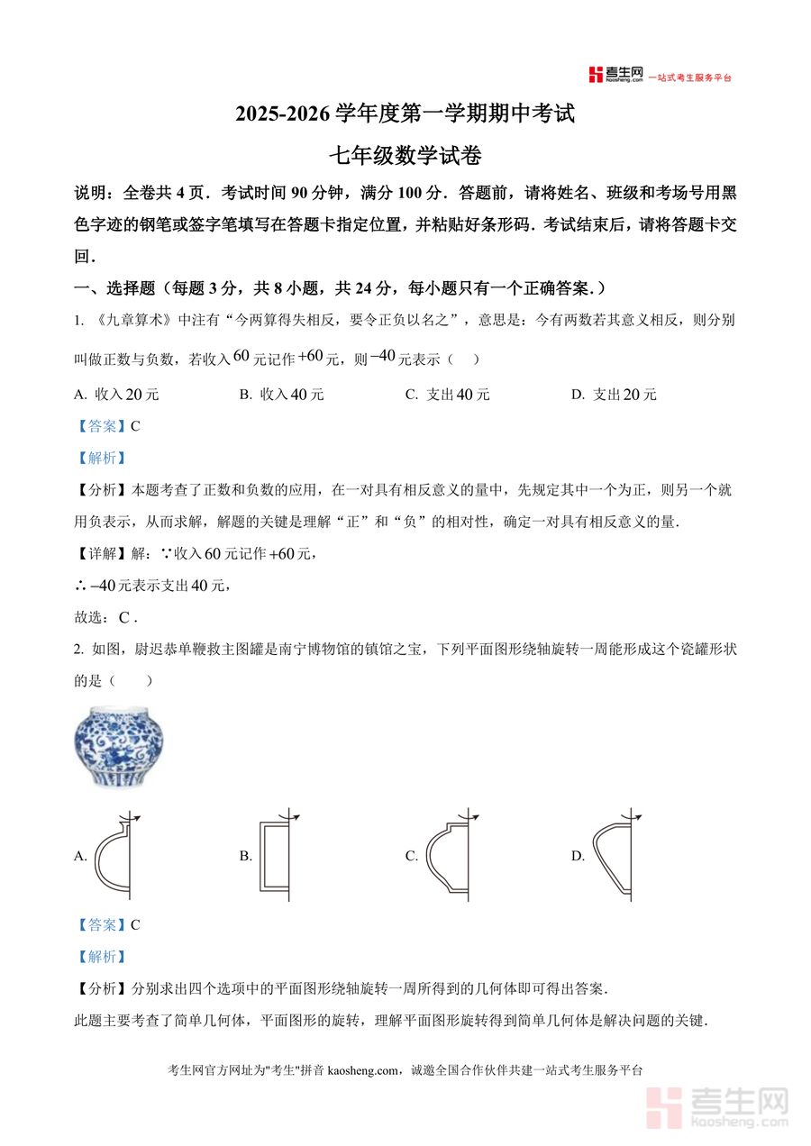 《精品解析:广东省深圳市福田区外国语学校(集团)2025-2026学年七年级上学期期中数学试卷(解析版)》是一份针对深圳本地校考需求打造的专业备考资料。文件包含完整期中试卷原题及详尽解析,覆盖有理数概念及运算、整式加减、几何图形初步等七年级上学期核心知识点;解析部分不仅提供正确答案,还针对每道题目的命题意图(如《九章算术》中正数负数应用)、解题思路(如科学记数法a×10ⁿ中a与n确定方法)及易错点(如同类项合并规则)进行深度拆解,帮助学生把握考点本质,属于高质量真题解析类资料。