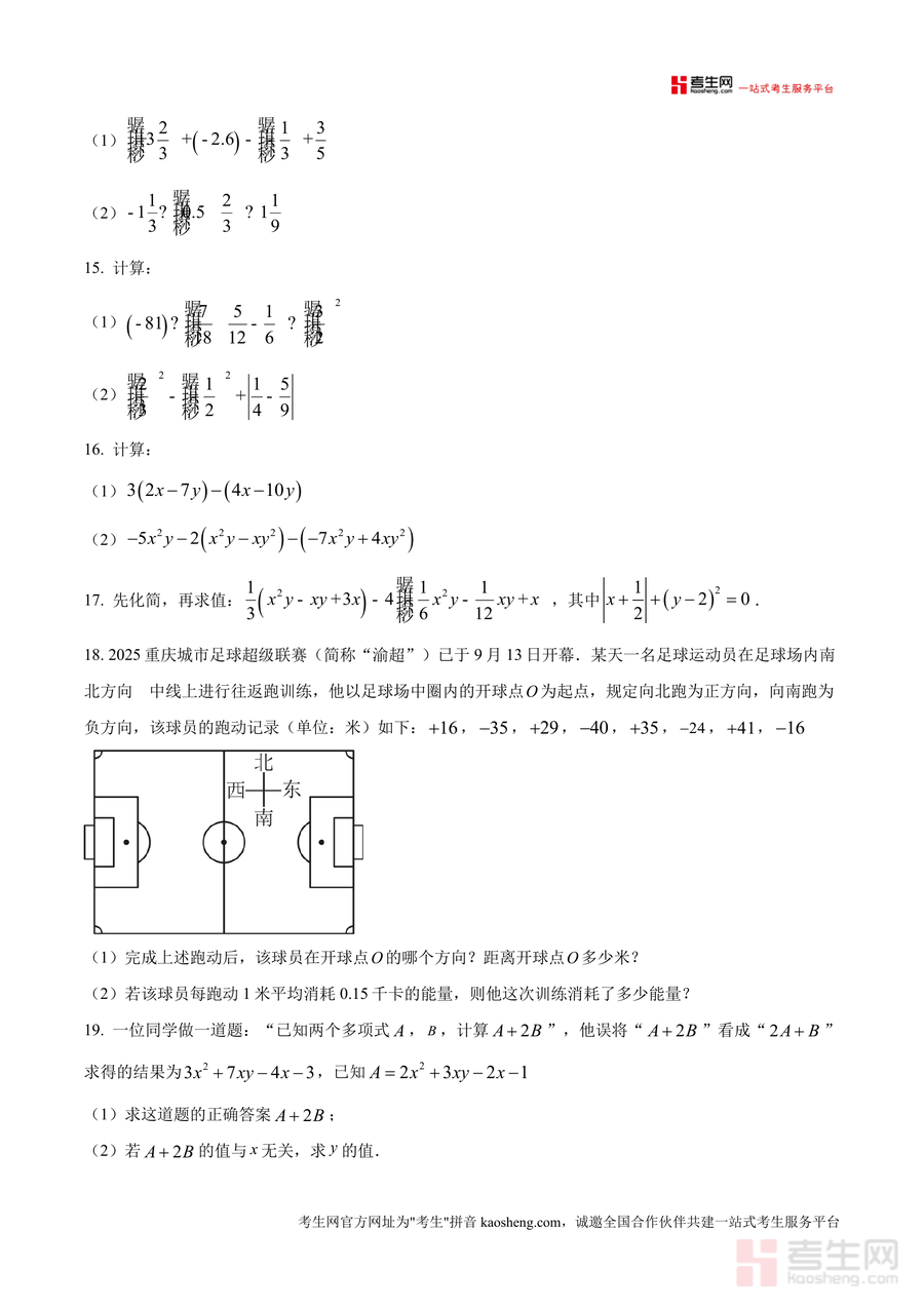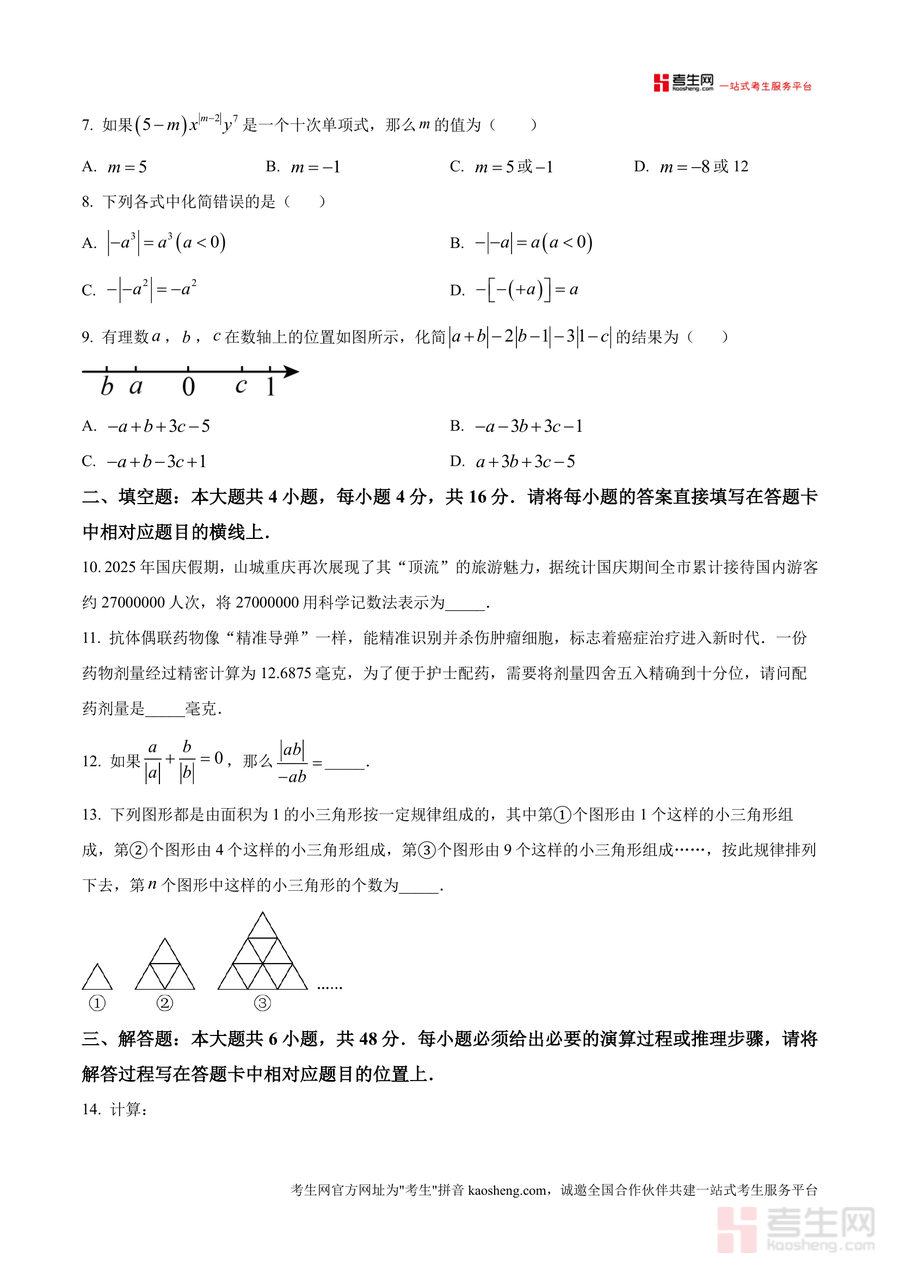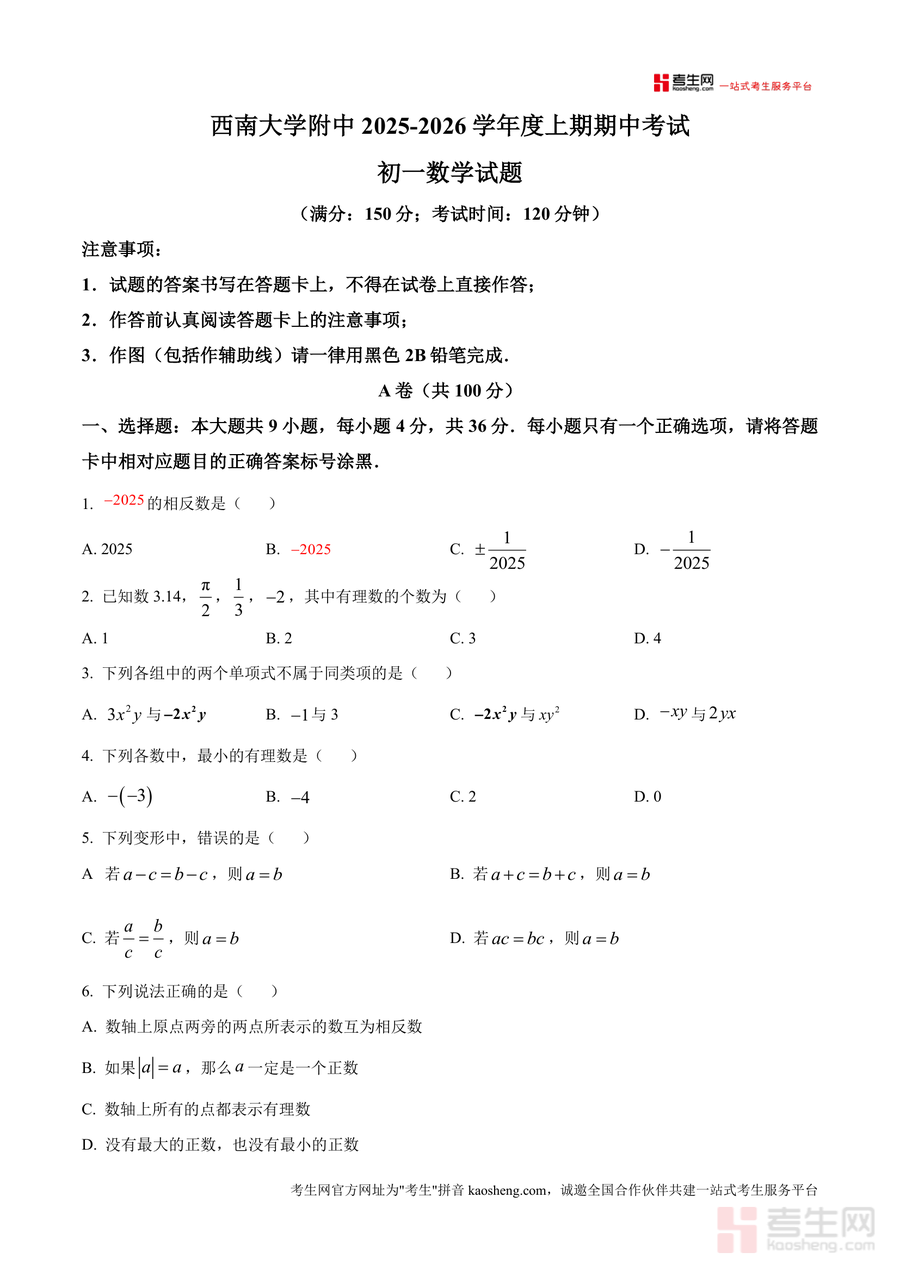 《精品解析:重庆市西南大学附中2025-2026学年上学期七年级期中数学试题(原卷版)docx》是一份针对西南大学附中七年级学生及教师群体的期中数学备考核心资料,主要包含该校该学年上学期期中数学考试完整原题及规范答题要求。试卷结构分为A卷(100分)与B卷(50分),满分共150分,考试时长120分钟;题型覆盖选择题、填空题、解答题三大类共七大题——A卷含9道选择、4道填空、6道解答题,B卷含3道选择、3道填空、3道解答题,题目设计融入重庆本地实际情境如国庆旅游人次统计、足球训练数据等,严格贴合该校教学大纲与期中考点分布。