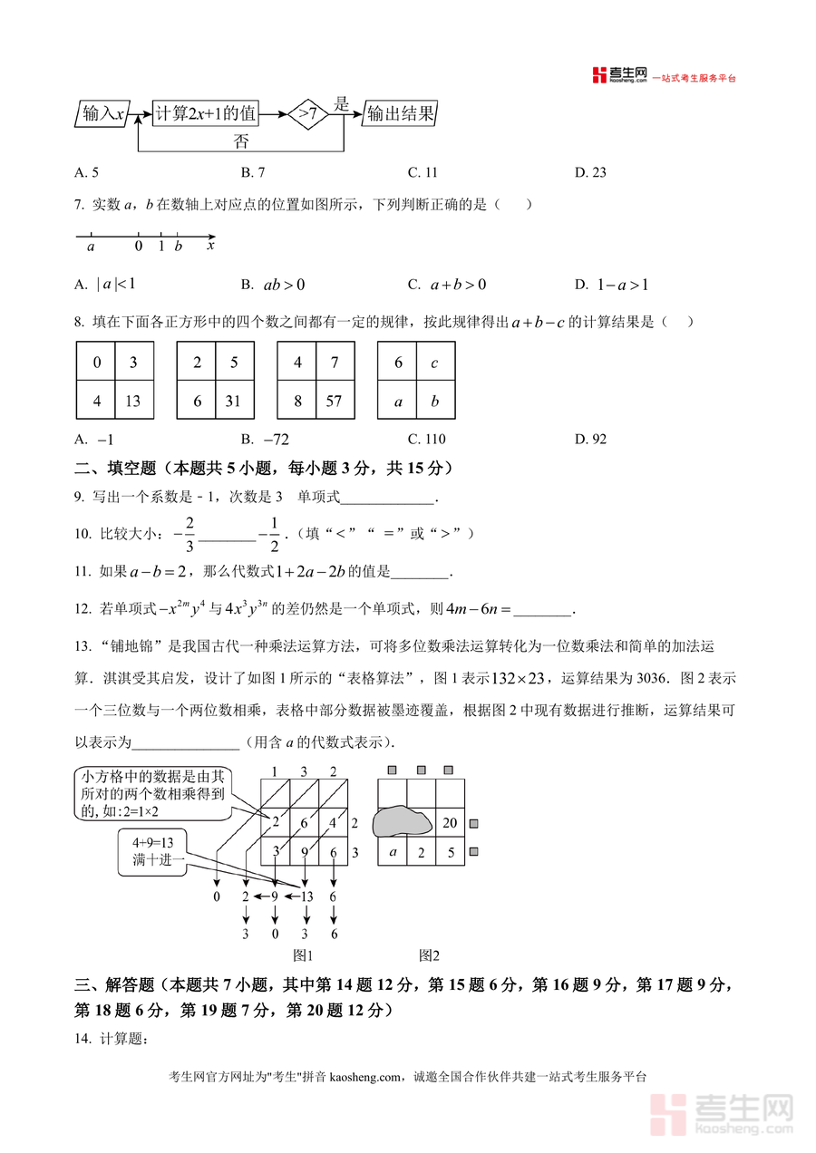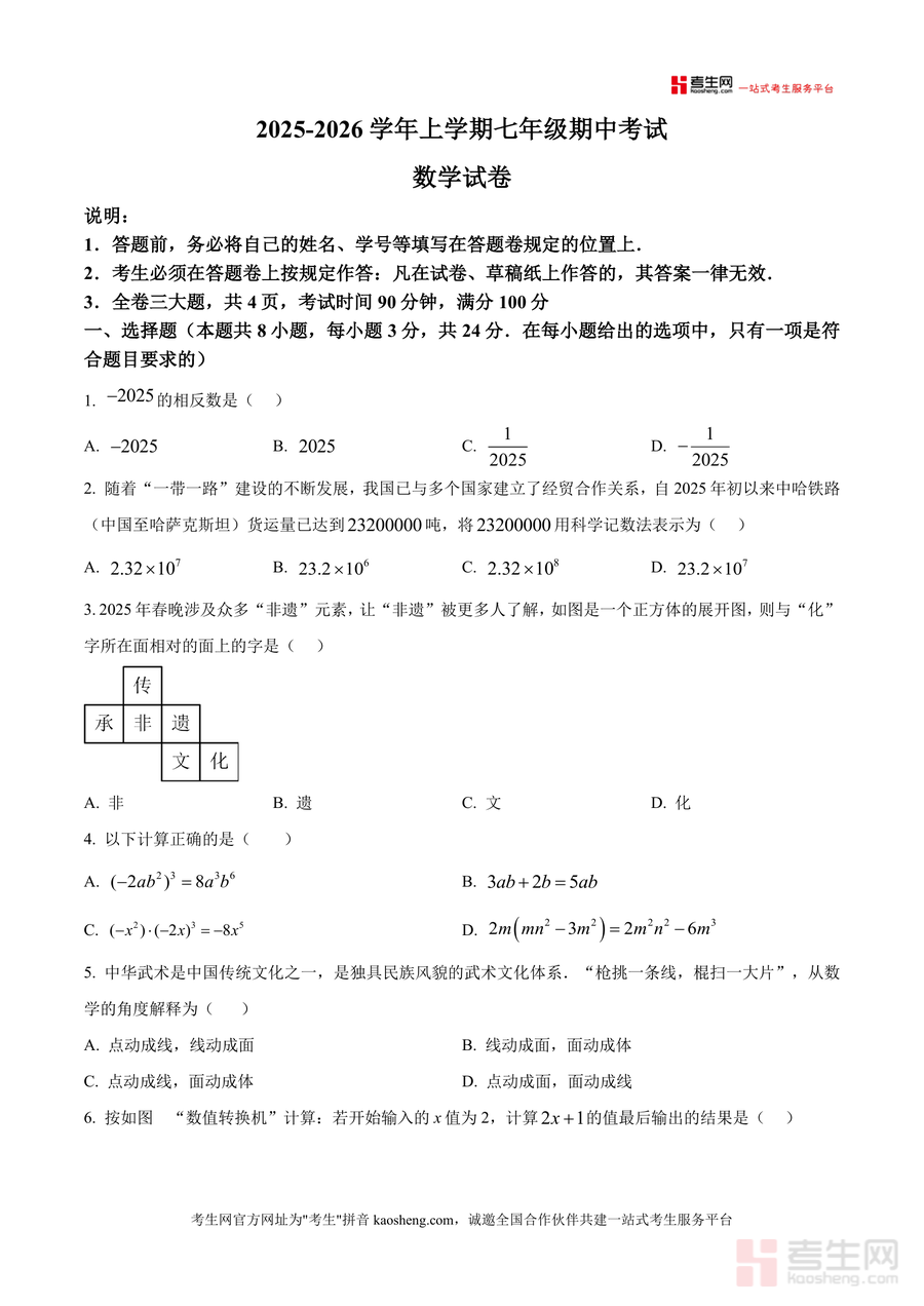 《精品解析:广东省深圳市福田区深大附中创新中学2025-2026学年七年级上学期期中考试数学试题(原卷版)docx》是一份贴合深圳福田区初中数学教学实际、聚焦七年级上学期核心知识的高质量备考资料。该资料包含三大题型共20道题目,覆盖相反数、科学记数法、正方体展开图、整式运算、几何三视图等七年级上册数学核心知识点,题型分布与分值设置严格遵循深圳本地期中测试标准,能精准反映深大附中创新中学的教学侧重点与命题风格。其特色在于题目设计兼顾基础巩固与能力提升,既包含对概念的直接考查,也设置了如"铺地锦"算法应用、数轴动点分析等具有思维拓展性的题目,有效衔接课堂所学与实际应用。