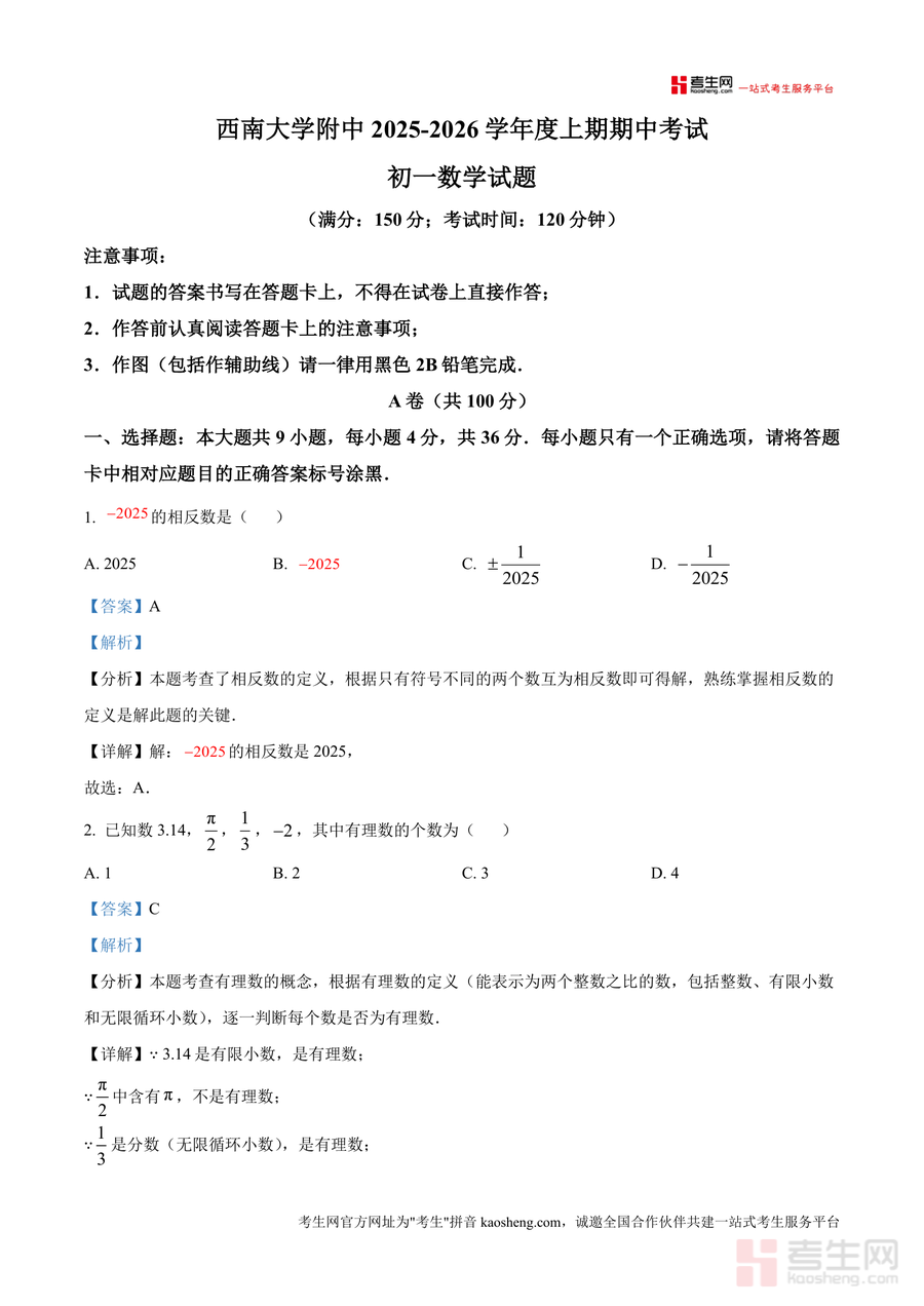 《精品解析:重庆市西南大学附中2025-2026学年上学期七年级期中数学试题(解析版)》是一份针对七年级学生期中数学备考需求打造的专业真题解析资料。该资料包含完整试题(满分150分,分A/B卷)及逐题详细解析,覆盖选择题(如相反数定义、有理数判断)、填空题(科学记数法、四舍五入)、解答题(有理数混合运算、整式化简求值)等题型;特色亮点在于依托西南大学附中名校命题权威性,解析部分不仅给出答案,还深度拆解考点(如同类项判断标准、绝对值化简规则)、解题思路及易错点提示,帮助学生理解知识本质而非机械记忆。