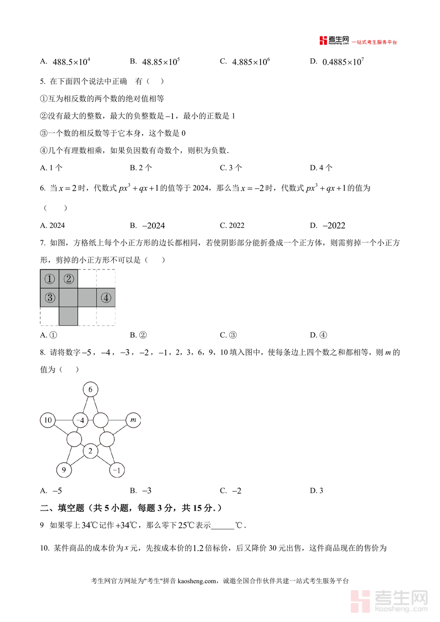 该试卷核心用途为七年级学生考前全真模拟训练、教师备课参考及家长辅导孩子复习。使用场景包括课堂限时测试以适应考试节奏,课后自主刷题巩固知识点,考前查漏补缺明确薄弱环节。用户价值方面,学生通过练习可熟悉深圳本地期中命题规律(如高频考点科学记数法、相反数与绝对值应用),提升应试能力;教师能借助试卷把握教学重难点,优化教学策略;家长可直观了解孩子学习短板,辅助制定针对性复习计划。其备考优势在于贴合石厦学校教学实际,题型设置与分值分布符合深圳期中统考标准,能有效帮助学生提前适应考试要求。