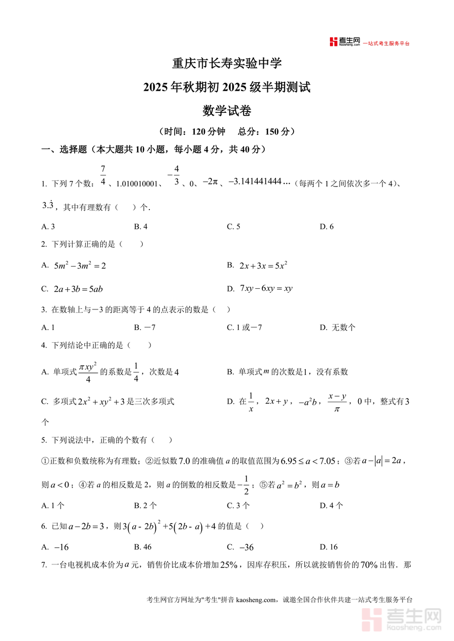 《精品解析:重庆市长寿实验中学校2025-2026学年七年级上学期11月期中数学试题(原卷版)》是一份针对重庆市长寿实验中学七年级上学期期中数学测试的权威备考资料原卷版,内容覆盖有理数分类与运算、整式化简求值、数轴应用、规律探究、新定义运算等七年级上册数学核心知识点。题型设置严格遵循该校期中测试标准:选择题10小题共40分、填空题8小题共32分、解答题7小题共78分,考试时间为120分钟总分150分。其特色亮点在于真实还原该校期中命题风格,题目设计贴合学生阶段性学习重点,能精准反映校考考查方向与难度梯度。