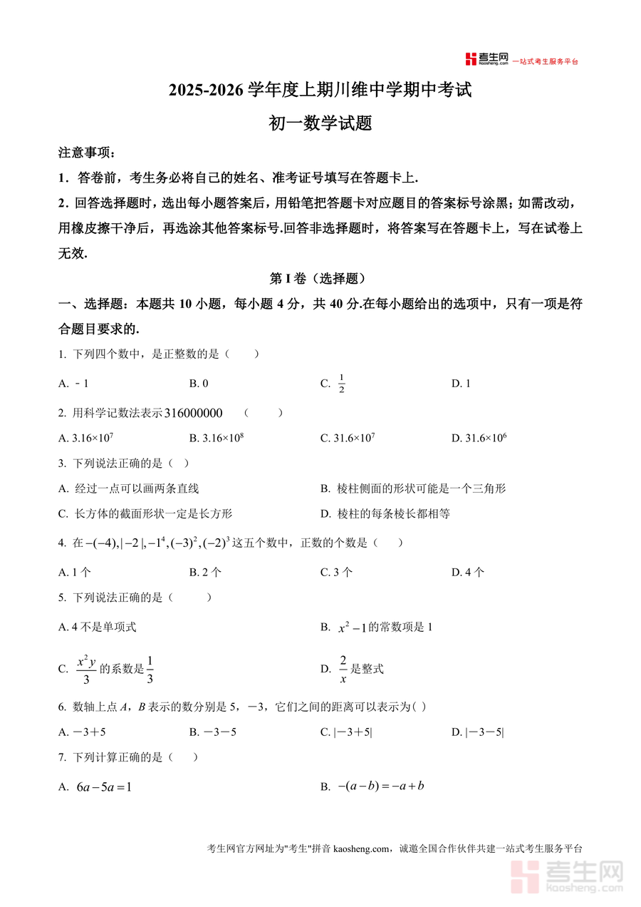 《精品解析:重庆市长寿川维中学校2025-2026学年七年级上学期11月期中数学试题(原卷版)》是一份针对七年级上学期期中阶段数学学习的优质备考资料,精准覆盖有理数运算、科学记数法、整式加减、一元一次方程及数轴应用等核心知识点。该试题严格遵循重庆地区初中数学教学大纲及川维中学校期中命题规律编制,包含选择题(10小题)、填空题(6小题)、解答题(9小题)三大题型共25道题目,全面考查学生对基础概念理解深度、运算准确性及逻辑思维能力。其特色亮点在于试题结构与本地期中统考高度贴合,融入规律探究、实际应用及新定义题型等思维拓展内容,能有效检测学生知识掌握程度与应试能力。