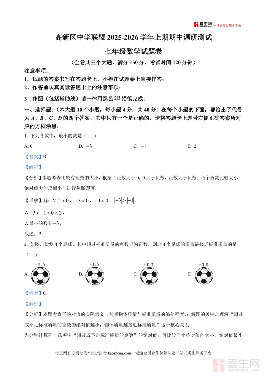 《精品解析:重庆市高新区2025-2026学年七年级上学期期中考试数学试卷(解析版)》是一份针对重庆市高新区七年级学生期中数学备考设计的专业备考资料。资料包含高新区中学联盟该学年上期期中调研测试数学试题原题及全卷详细解析版,覆盖选择(10小题)、填空(6小题)及解答(若干小题)三大题型。其核心特色在于每道题均配备精准考点定位(如有理数大小比较、代数式书写规范等)、分步解题思路拆解、易错点警示及必要拓展延伸内容,帮助学生理解题目本质与命题逻辑。