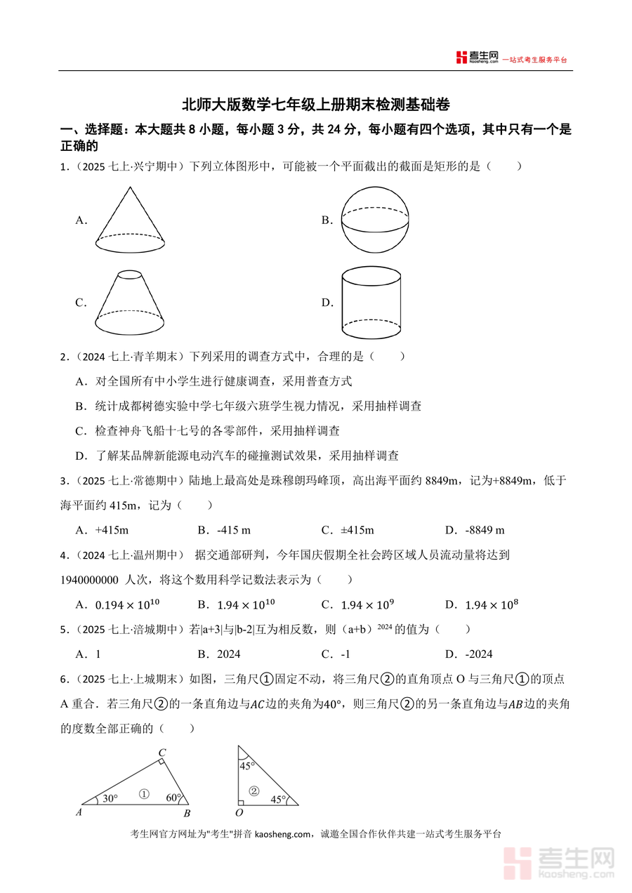该资料适用于北师大版七年级上册的在校学生、需要巩固数学基础的学习者以及准备期末备考的群体。作为基础卷类资料,它能有效夯实核心知识体系,其整合多地区真题资源且题型全面的特点具有不可替代性;长期来看,通过练习可培养规范答题习惯与逻辑思维能力,为后续数学学习奠定坚实基础,是期末备考阶段不可或缺的实用资料。