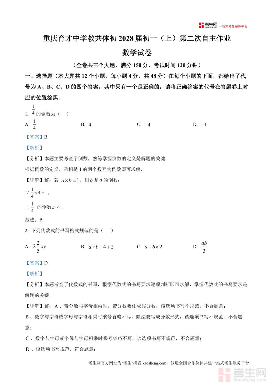 《精品解析:重庆育才中学教共体2025-2026学年七年级上学期期中数学试卷(解析版).docx》是一份针对重庆育才中学教共体初一年级期中数学测评设计的专业备考资料,涵盖选择题(12道)、填空题(10道)、解答题(7道)三大题型共29道题目,每道题均配备详实解析。核心内容包括考点精准定位(如倒数定义、代数式书写规范)、解题思路分步推导(如《九章算术》盈不足问题方程构建)、易错点深度提示(如数轴线三要素判断),特色亮点在于结合教共体教学特色,突出基础概念应用与综合能力考查,解析过程注重方法迁移与思维拓展。