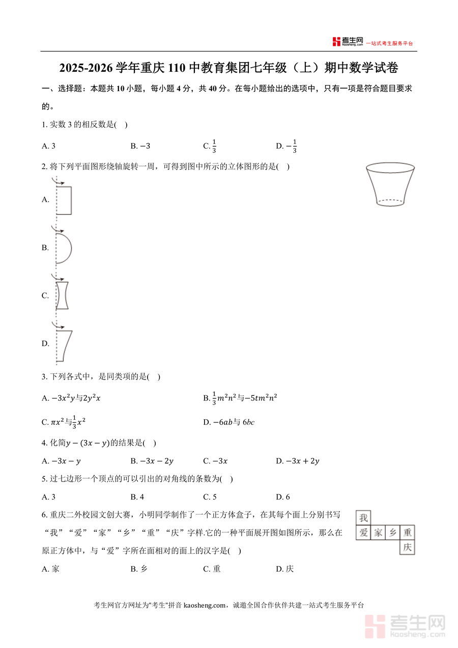 适用人群为重庆地区七年级学生(尤其是重庆110中教育集团及周边学校学生)、初中数学教师及关注孩子数学备考进度家长。该试卷作为本土优质期中真题资源,具有不可替代性:既贴合本地教学实际,又能帮助学生巩固基础并培养逻辑思维能力;长期来看,通过对真题题型与考点分析总结,可为后续数学学习奠定扎实基础,是七年级学生期中备考不可或缺重要资料。