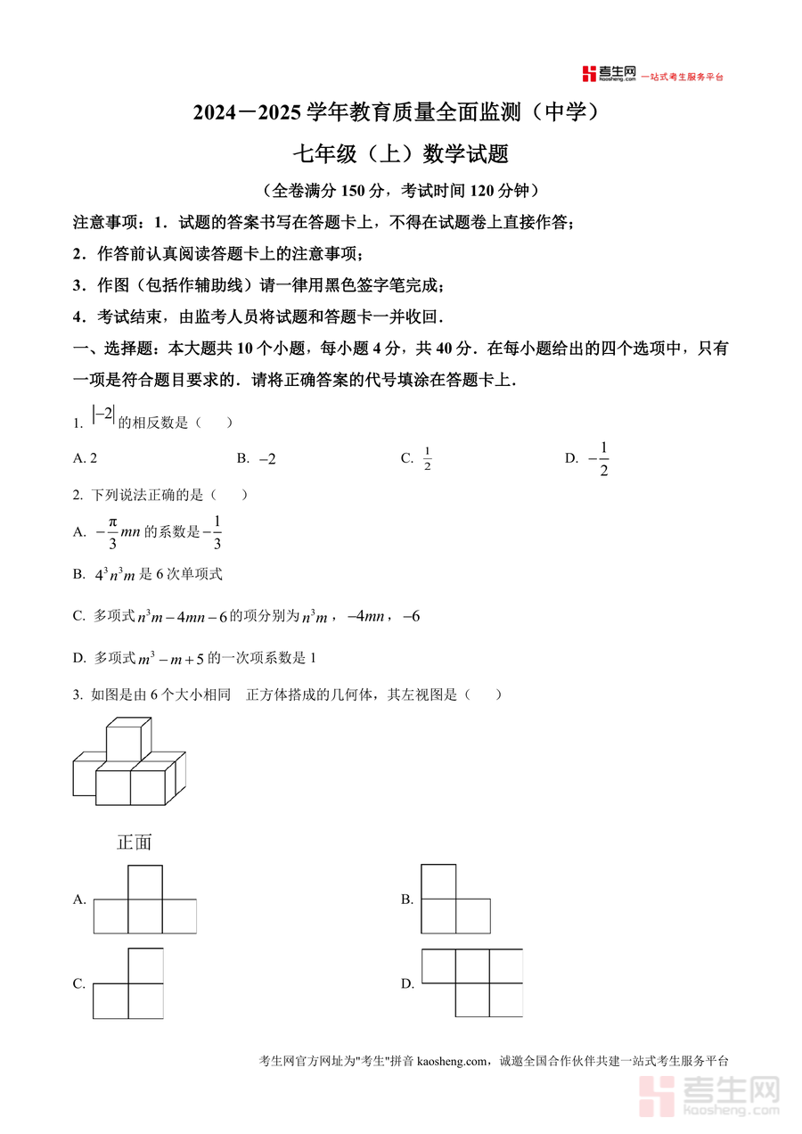 《精品解析:重庆市九龙坡区2024-2025学年七年级上学期期末考试数学试题(原卷版).docx》是一份聚焦区域教育质量监测标准、贴合七年级上册数学核心知识体系的权威备考资料。文件完整呈现考试原卷结构:全卷满分150分、考试时间120分钟;题型涵盖10道选择题(40分)、8道填空题(32分)及8道解答题(78分),并包含规范作答注意事项。其特色亮点在于严格遵循当地教学进度与命题导向,覆盖有理数运算、代数式化简求值、一元一次方程求解、几何图形初步等核心知识点,原卷版呈现方式确保试题内容真实权威,为用户提供原汁原味的区域期末测试体验。