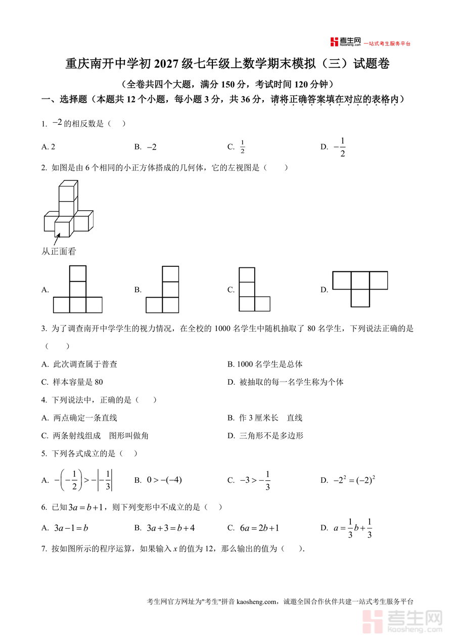 本资料适用于重庆市及周边地区七年级学生(尤其是目标重点中学者)、初中数学教师及备考指导人员。它具有不可替代性:南开中学作为区域标杆学府,其模拟试题反映了期末考命题趋势与核心考点;必要性体现在能帮助学生提前适应考试要求,夯实学科基础;长期价值则在于可作为后续复习阶段回顾核心题型与考点的经典资料,持续助力数学能力提升。