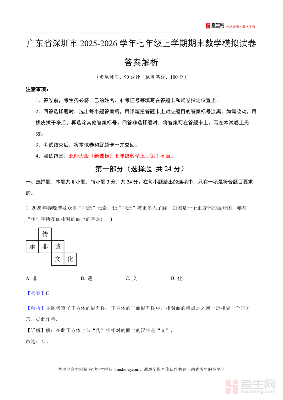 《广东省深圳市2025-2026学年七年级上学期数学期末模拟卷-教师用卷.docx》是一份针对深圳地区七年级上册数学期末备考设计教师专用教学资料。该资料包含完整模拟试卷及详尽答案解析,考试时间90分钟、满分100分,测试范围覆盖北师大版(新课标)七年级数学上册第1~6章核心知识点。其特色亮点在于解析深度贴合教学需求,不仅提供正确答案,还包含解题思路、易错点提示(如科学记数法a取值范围)及分类讨论方法(如绳子对折剪断问题),助力教师精准把握考点细节。
