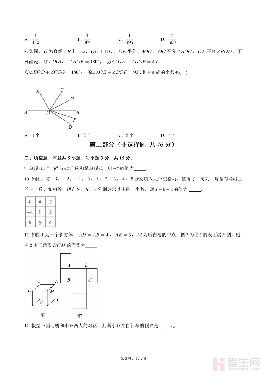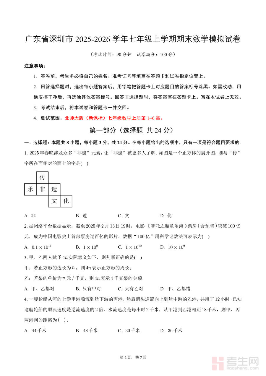《广东省深圳市2025-2026学年七年级上学期数学期末模拟卷.pdf》是一份针对深圳地区七年级上册数学期末备考的专业模拟资料,严格依据北师大版新课标七年级数学上册第1~6章内容编制,涵盖选择题(8小题24分)、填空题(5小题15分)及解答题(7小题61分)三大题型。其特色亮点在于贴合深圳本地教育实际与时代热点——如融入非遗文化元素、十五运会志愿服务调查等真实情境素材,题型设计兼顾基础与能力提升,既覆盖有理数运算、代数式化简求值、几何图形展开与角度计算等核心考点,又通过创新题型考查学生逻辑推理与实际问题解决能力。