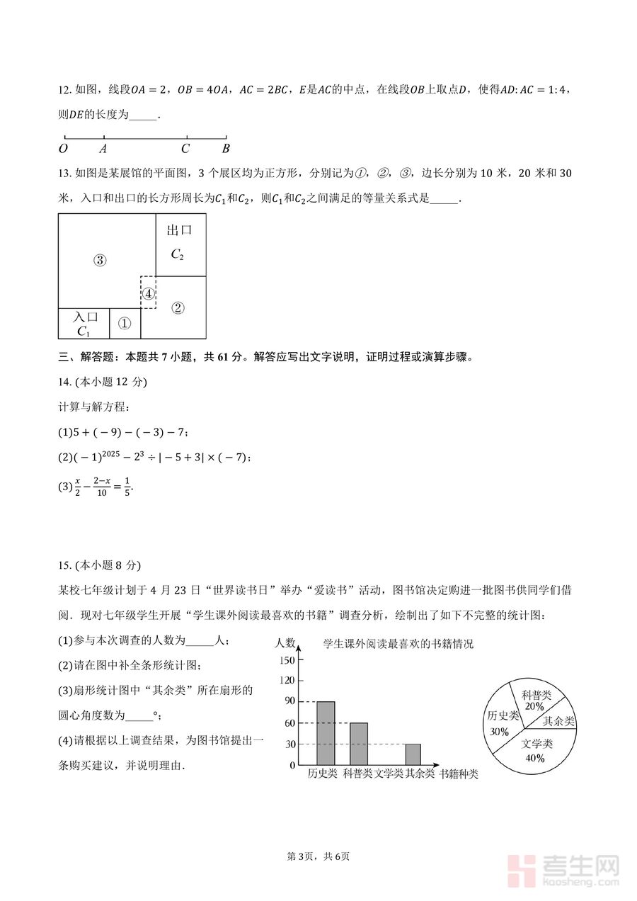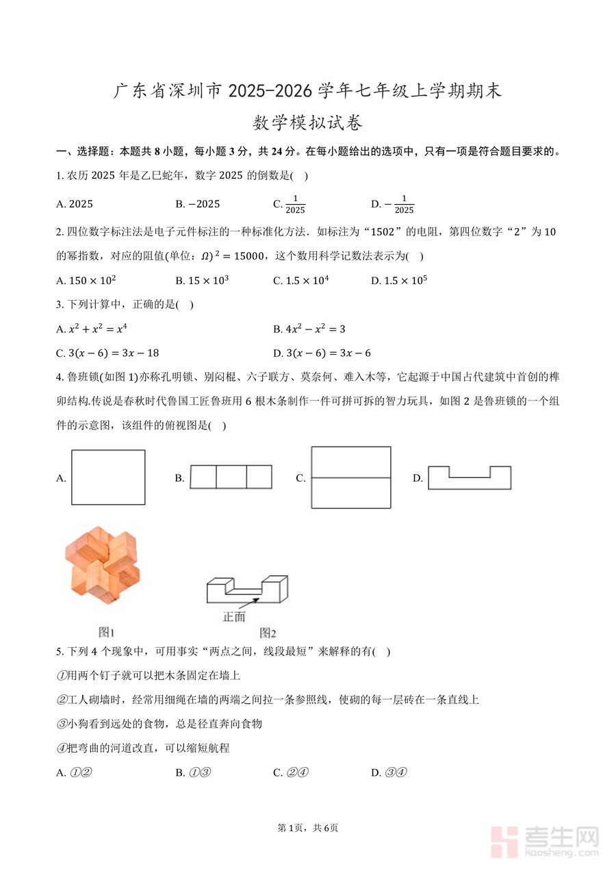 《广东省深圳市2025-2026学年七年级上学期数学期末模拟试卷(北师大版).pdf》是一份适配北师大版教材体系、精准对接深圳本地七年级上册数学期末考纲与命题趋势的专业化备考资料。试卷涵盖有理数运算、代数式化简求值、一元一次方程应用、几何图形识别与计算等核心知识模块,题型结构严格遵循深圳期末真题标准,包含8道选择题、5道填空题及7道解答题。其特色亮点在于将本地文化元素(如鲁班锁组件俯视图分析)、生活实际场景(如医保报销计算、读书日调查统计)与经典数学模型(如斐波那契数列兔子繁殖问题、科克雪花曲线)深度融合,既强化基础知识点巩固,又拓展学生的数学应用与逻辑思维能力。