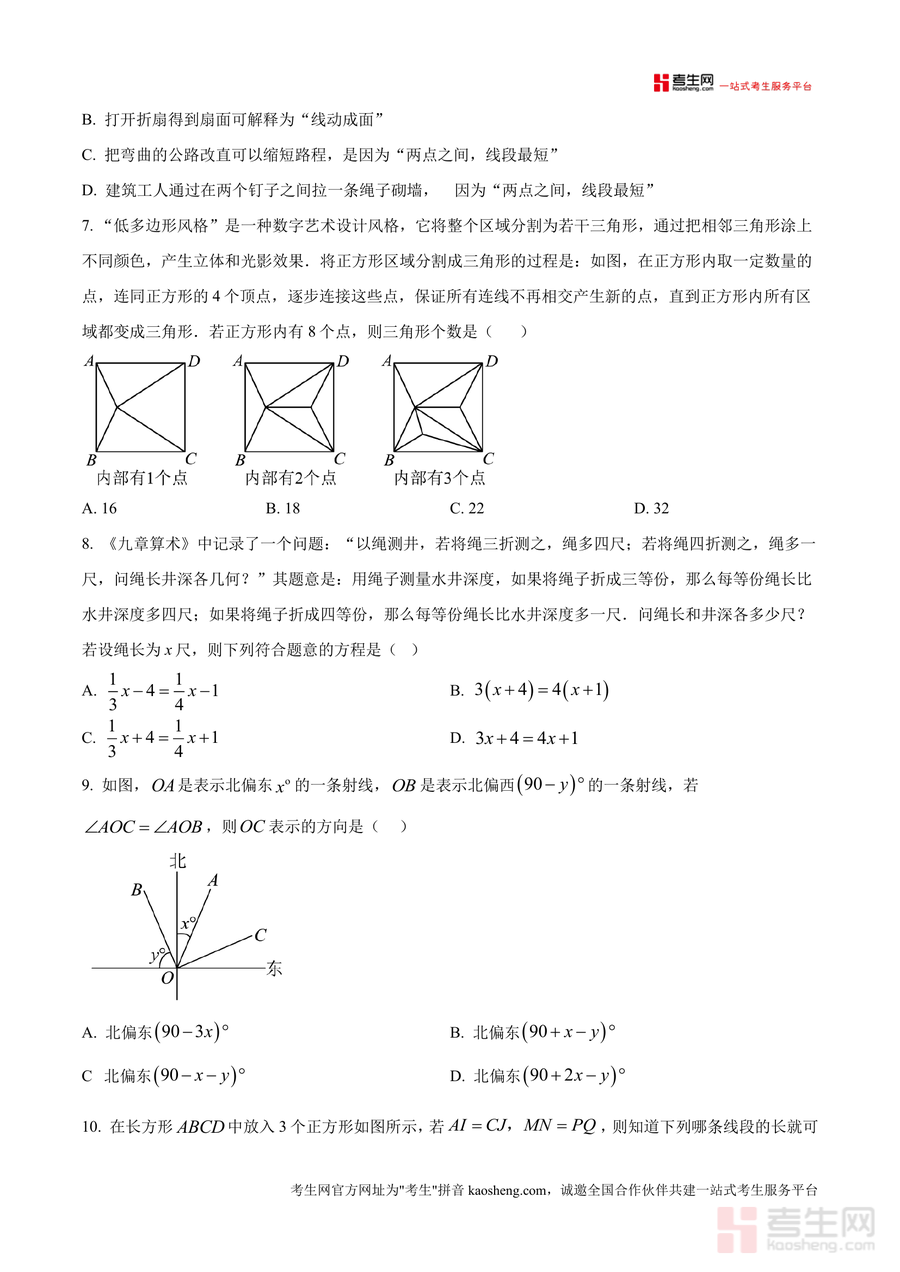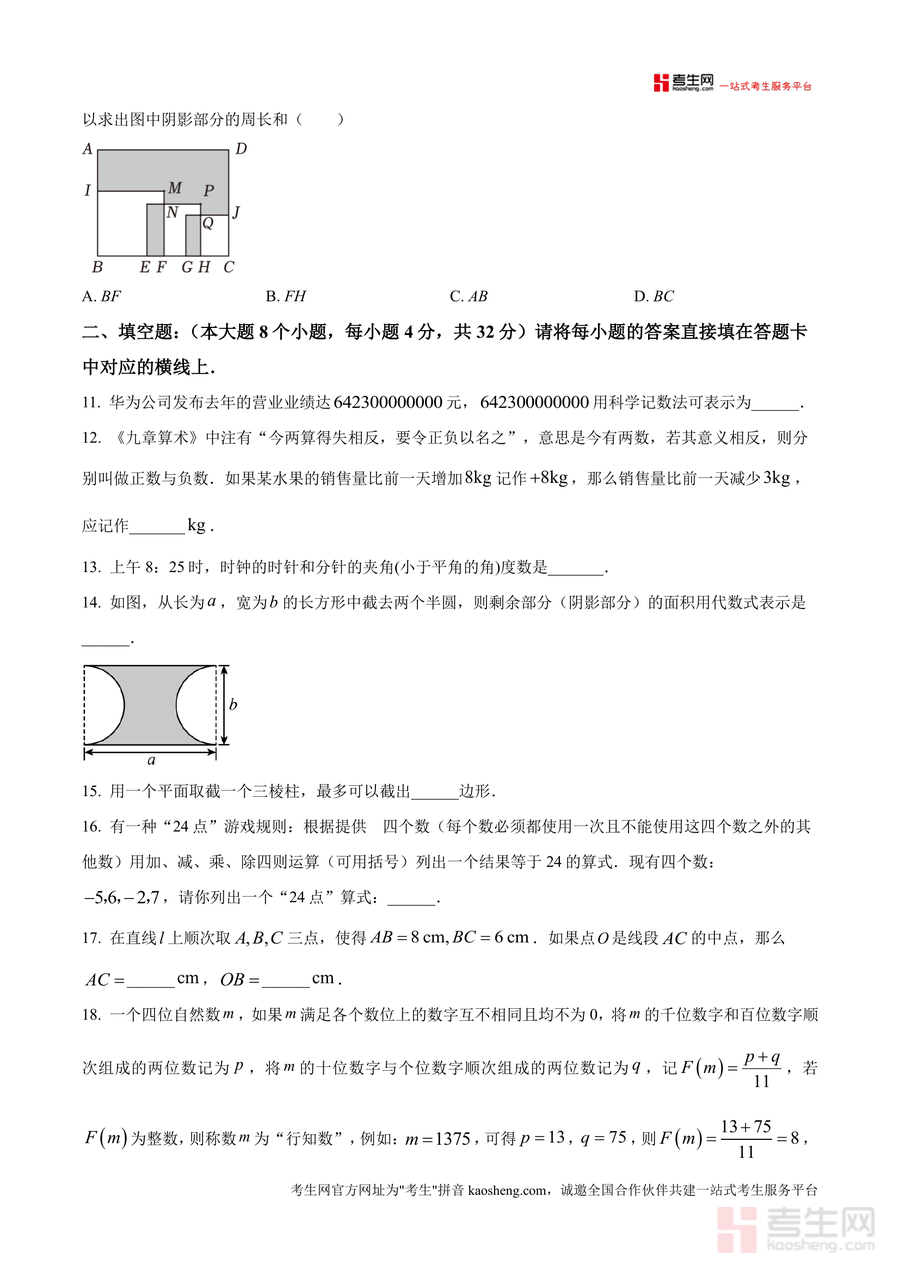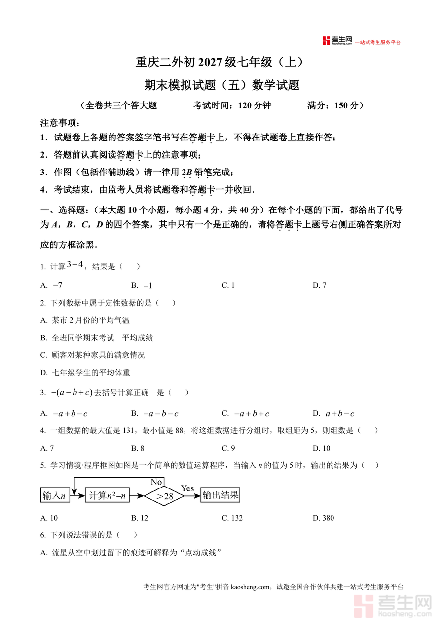 《精品解析:重庆市四川外语学院重庆第二外国语学校2024-2025学年七年级上学期期末模拟数学试题(原卷版).docx》是一份针对该校初一年级学生设计的高质量期末备考资料。该资料严格遵循该校期末考命题规范——全卷共三大题26小题,考试时间120分钟、满分150分,涵盖选择题(10道,含计算、数据类型判断等基础考点)、填空题(8道,涉及科学记数法、时钟夹角等知识应用)、解答题(8道,包含计算、尺规作图、解方程、统计分析及《九章算术》经典应用题等综合题型)。其特色亮点在于贴合该校教学进度与命题风格,融入生活情境(如体育用品销售)与数学文化元素,全面覆盖七年级上册核心考点,为学生提供真实考试场景下的训练素材。