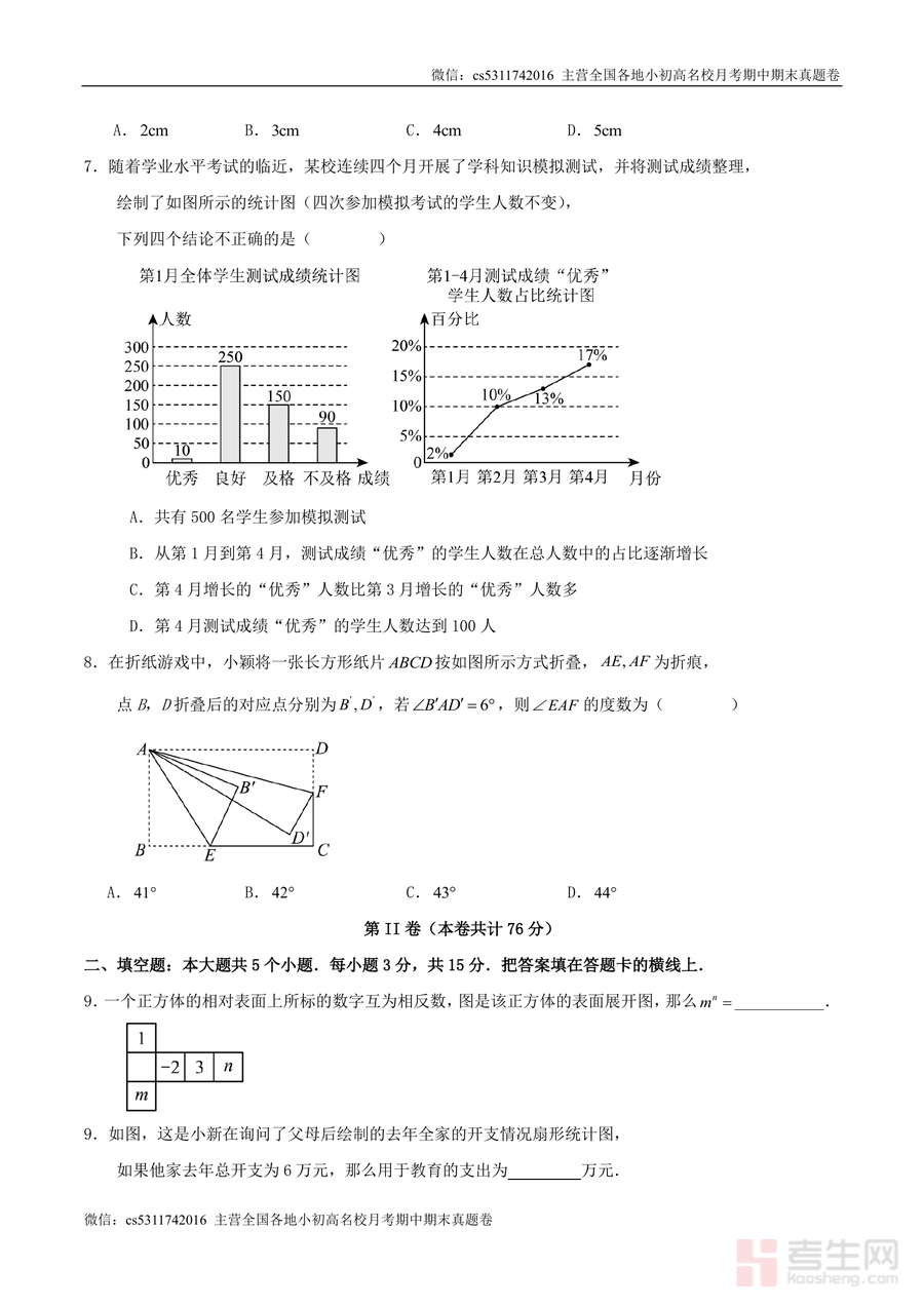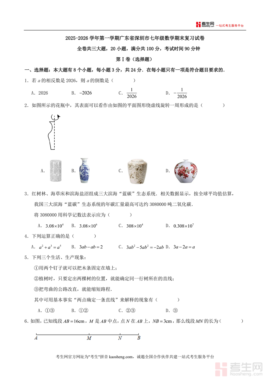 该试卷核心用途为期末模拟训练与知识点查缺补漏,适用场景包括课堂限时测试、家庭自主复习、教师备课辅助等。对学生而言,通过完成试卷可熟悉本地期末考题型分布与答题节奏,提升应试能力;对教师而言,可利用其进行阶段性学情检测,精准定位学生知识薄弱点;对家长而言,能辅助孩子进行自测,了解学习进度。其备考优势在于题目设计紧扣深圳本地考情,覆盖相反数与倒数、立体图形旋转、科学记数法、几何基本事实等高频考点,有效强化学生解题技巧与知识应用能力。
