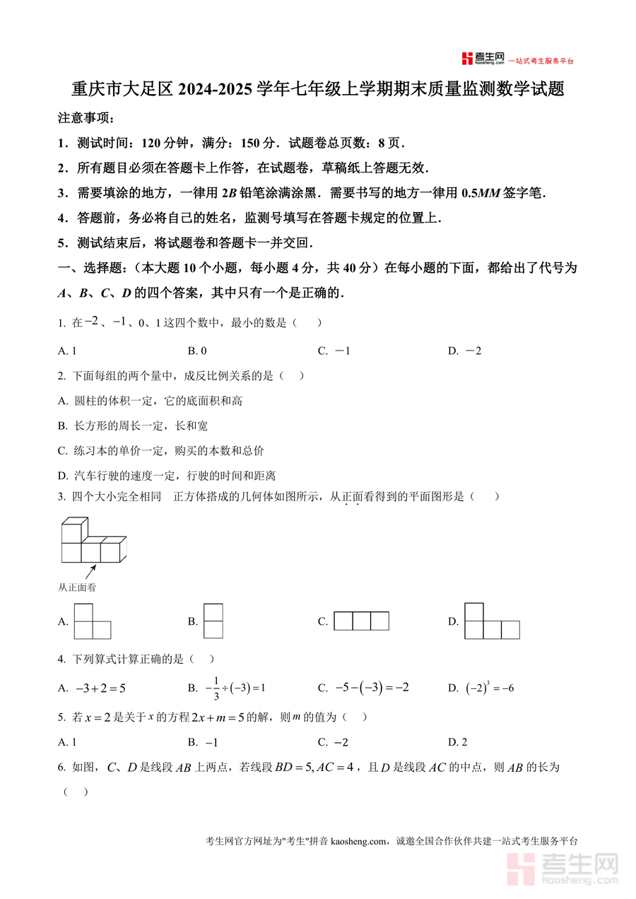 本资料适用于重庆市大足区及周边区域的七年级学生、初中数学教师及关注孩子学业的家长群体。作为区域官方期末监测真题原卷,其必要性在于不可替代地反映当地教学评价标准与学生学业水平要求,长期价值体现在帮助学生巩固七年级上学期数学基础,构建系统知识框架,为后续八年级数学学习奠定坚实基础,是期末备考阶段不可或缺的优质备考资料。