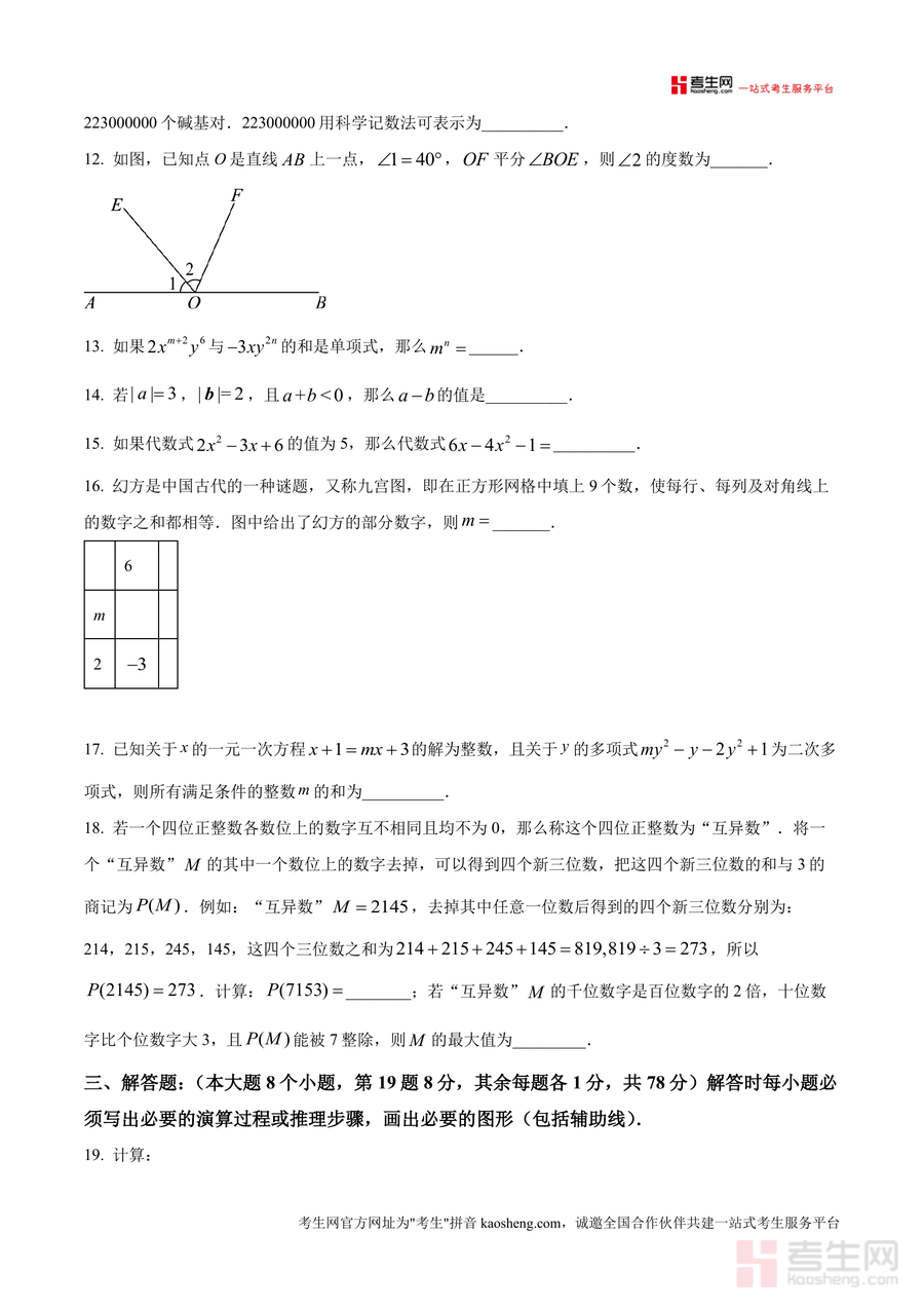 该资料核心用途为七年级数学期末备考阶段实战训练与考点梳理,适用场景包括学生自主刷题熟悉题型分布与答题规范、教师作为教学参考设计针对性复习方案、家长辅助孩子进行考前模拟测试;其用户价值在于帮助使用者精准把握大足区期末监测命题趋势与高频考点方向,通过原卷练习有效提升应试能力,备考优势体现在让学生提前适应考试时间分配与答题要求,减少考场陌生感,助力实际考试发挥最佳水平。