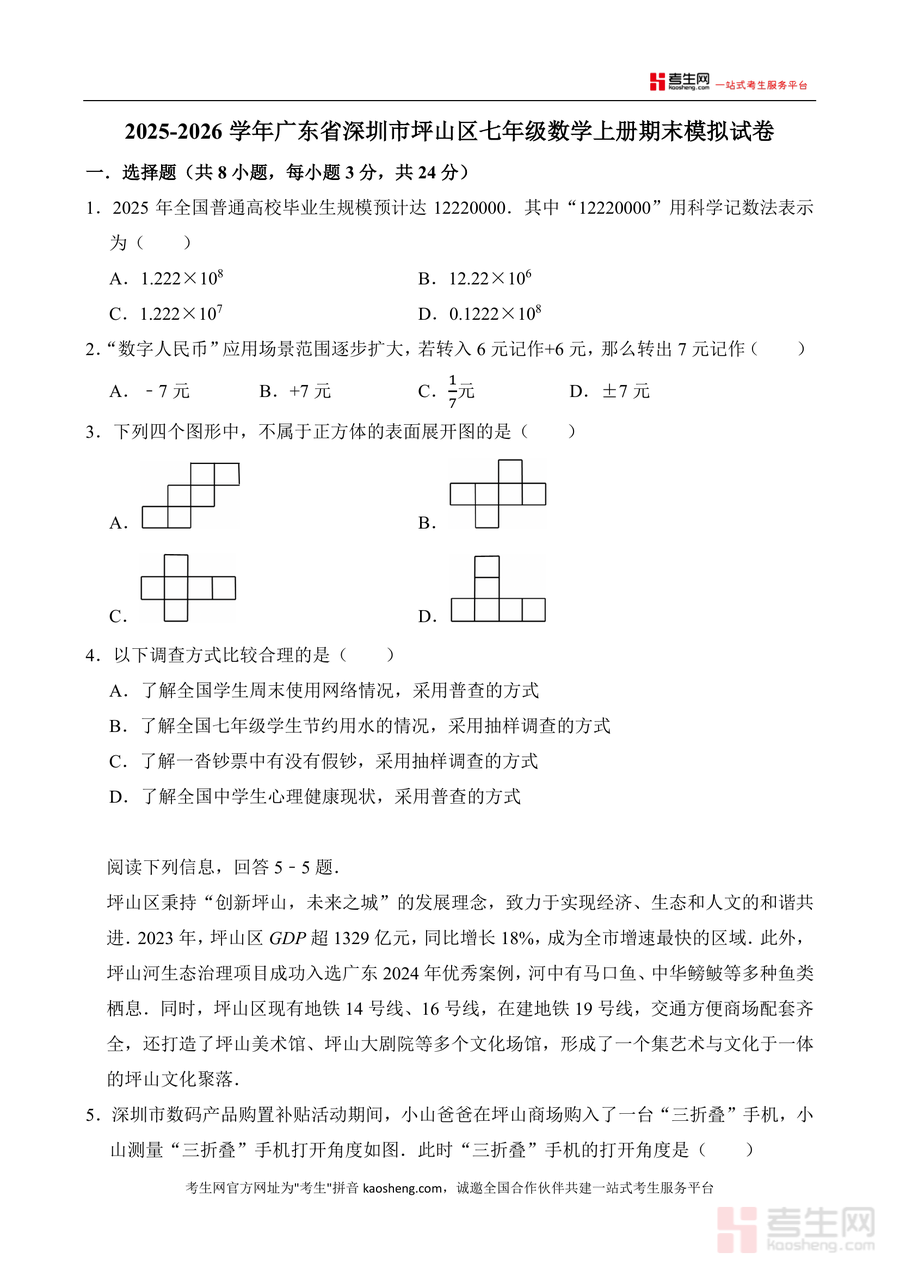 本资料适用于深圳市坪山区及周边地区七年级数学学习者、一线数学教师及需要辅导孩子学习的家长群体。作为针对性极强的区域化模拟试卷,它不仅能帮助学生高效备考期末,还能培养其运用数学知识解决实际问题(如本地经济数据计算) 的能力,具有不可替代的地域适配性与长期学习价值,是提升七年级数学成绩与应试能力 的重要工具。