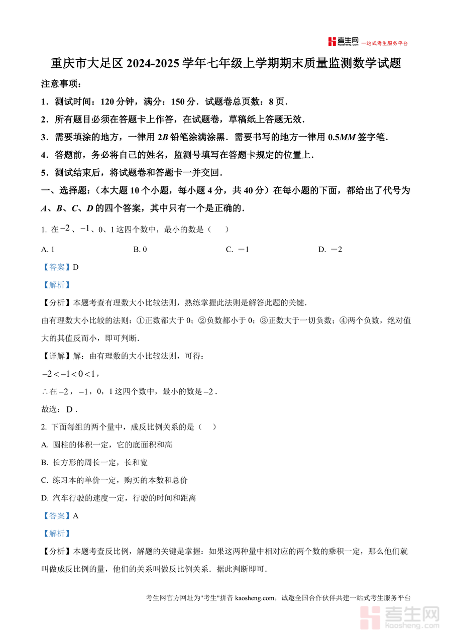 本资料适用于重庆市大足区及使用相同教材体系地区七年级学生数学教师及家长。作为本地期末质量监测的真题解析资料,它具有不可替代针对性,是学生期末备考必备工具;其对知识点深度解析与解题方法归纳不仅助力当前考试,更能帮助学生构建系统数学思维,为后续学习奠定坚实基础具有长期价值。