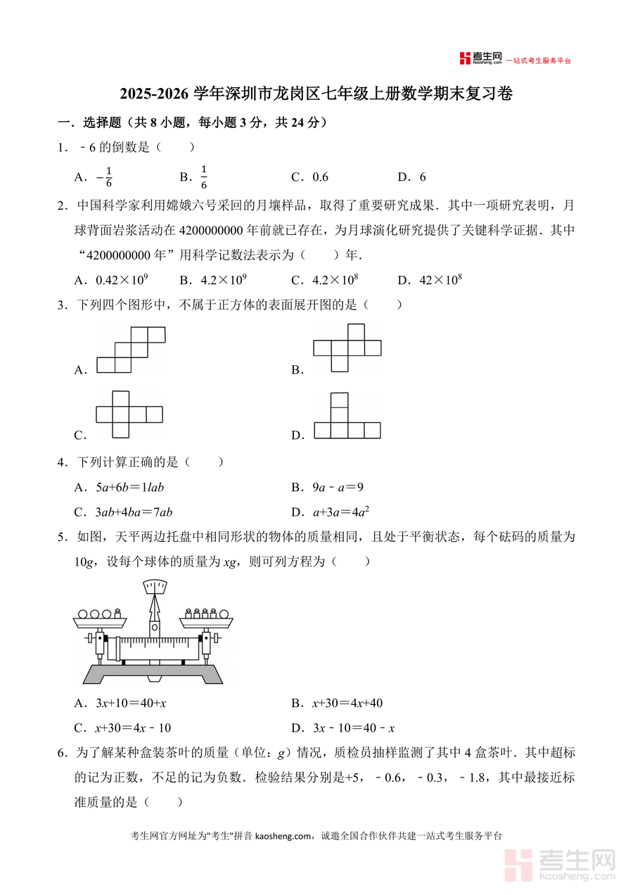 《广东省深圳市龙岗区2025-26学年七年级上册数学期末复习卷.docx》是一份针对龙岗区七年级上学期数学期末备考设计的专业复习资料,涵盖代数运算(如科学记数法、整式加减)、几何图形(正方体展开图、角平分线计算)、统计应用(抽样调查分析)及方程求解等核心模块,包含8道选择题、5道填空题与7道解答题。资料特色在于贴合本地考纲命题趋势,融入嫦娥六号月壤研究数据等实际情境素材,并配备详细参考答案与解析,解析部分不仅给出答案,还阐述解题思路、易错点及考点关联,帮助学生深度理解知识。