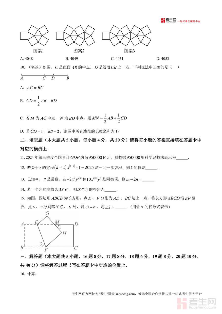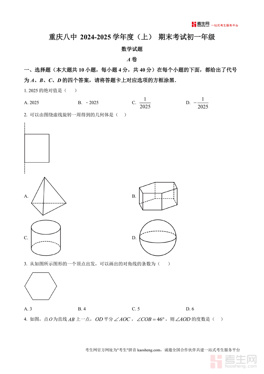 《精品解析:重庆市第八中学校2024-2025学年七年级上学期期末考试数学试题(原卷版)》是一份针对七年级上学期数学期末备考的高质量真题备考资料。该资料完整呈现重庆八中期末数学考试的A卷与B卷结构:A卷含选择题(含多选题)、填空题、解答题三大模块,覆盖绝对值计算、几何体旋转判定、角平分线性质、一元一次方程应用等基础考点;B卷通过综合性选择、填空及解答题拓展能力考查,涉及行程问题、几何动态变化等复杂题型。作为重点中学命题成果,其特色在于题型设置贴合课标要求且具鲜明地域命题风格,能精准反映七年级数学核心知识体系与能力考查方向。