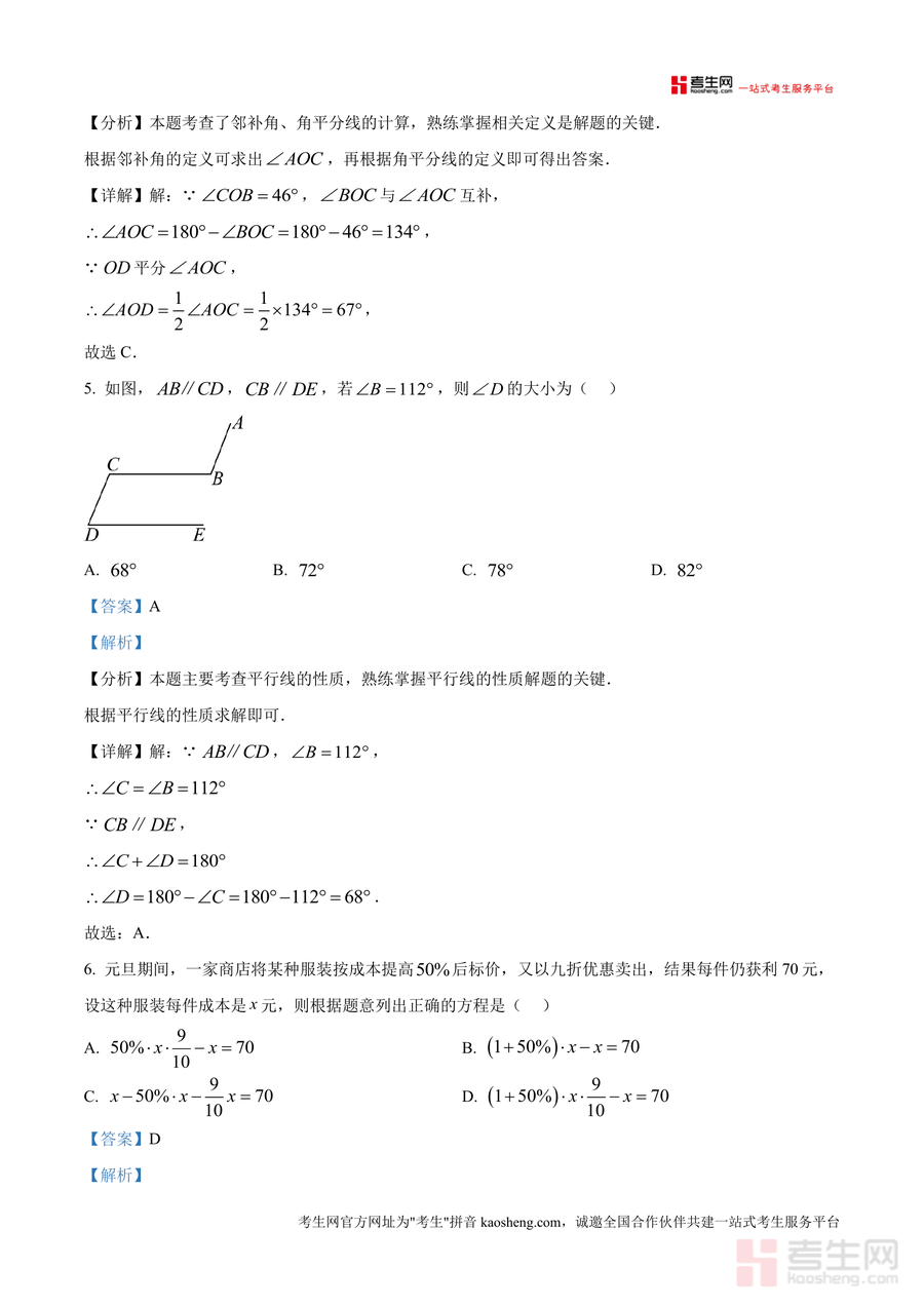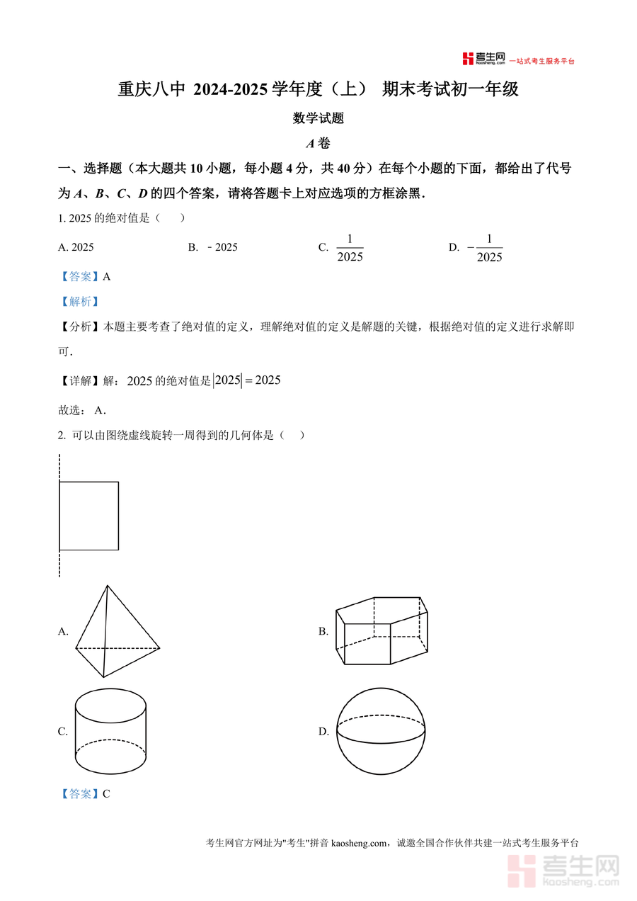 《精品解析:重庆市第八中学校2024-2025学年七年级上学期期末考试数学试题(解析版)》是一份聚焦七年级数学期末备考的权威真题解析资料。内容覆盖完整试卷结构,包含A卷基础题型(10道选择题、5道填空题、5道解答题)与B卷拓展题型(2道选择题),每道题目均配备专业级解析:“分析”环节精准定位考点(如绝对值定义、多边形对角线计算、平行线性质、一元一次方程应用等),“详解”部分呈现分步解题逻辑,同时标注易错点与答题技巧。特色亮点在于将真题解析与应试能力培养深度结合,帮助学生从“会做题”到“会考试”。