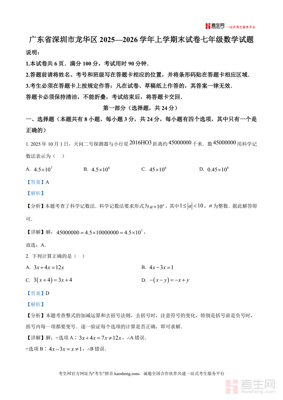 《精品解析:广东省深圳市龙华区2025—2026学年上学期末试卷七年级数学试题(解析版).docx》是一份针对龙华区七年级上学期数学期末考编写的高质量真题解析资料。其核心内容覆盖试卷全题型(选择题、填空题、解答题共三大模块),每道题配备精准答案及深度解析——包含考点定位(如科学记数法、整式运算、方位角计算等核心知识点)、详细解题步骤、易错点提示与思路拓展。特色亮点在于严格贴合龙华区本地教学进度与考纲要求,解析过程注重逻辑推导与方法总结,帮助使用者理解考点本质而非机械记忆。