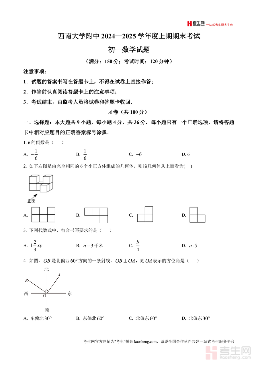《精品解析:重庆市西南大学附属中学校2024—2025学年七年级上学期期末数学试题(原卷版).docx》是一份针对七年级上册数学期末备考设计的权威真题资料,核心定位为名校命题导向的实战型备考资源。文件包含满分150分的完整试题结构(A卷100分+B卷50分),题型覆盖选择题(9小题)、填空题(4小题)、解答题(6小题,A卷)及提升类题型(选择3题、填空3题、解答3题,B卷),内容涵盖有理数运算、代数式化简、一元一次方程、几何图形初步(方位角、角平分线、立体图形视图)等七年级上册核心知识点。其特色亮点在于依托西南大学附中优质教学资源,贴合重庆本地教学大纲与课标要求,既包含基础巩固类题目,又设置能力拓展类B卷题型,能全面检测学生知识掌握程度与综合应用能力。